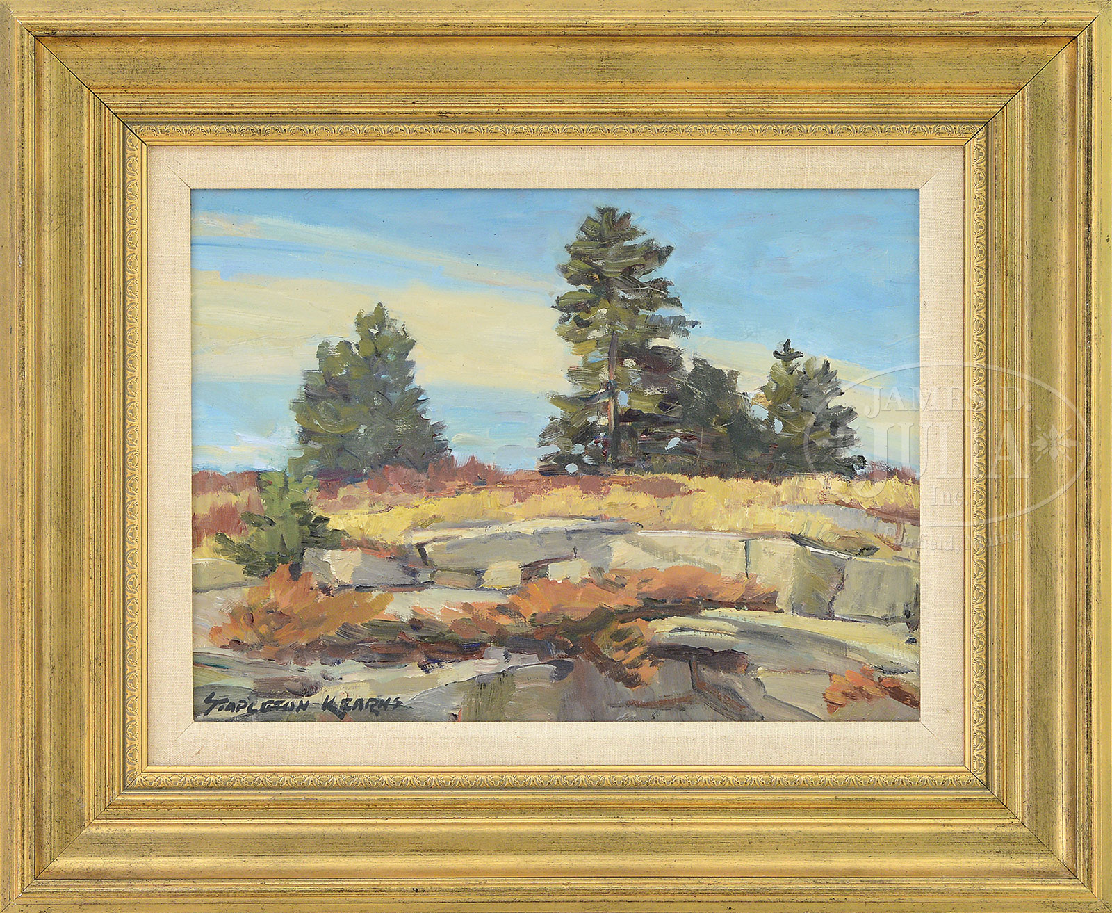 STAPLETON KEARNS (American, 1952-) “ORLAND, MAINE”.Oil on board Housed in a contemporary giltwood frame Signed lower left “Stapleton Kearns”, titled inscribed in pencil on paper backing SIZE: 12″ x 16″. Overall: 19-1/4″ x 23-1/4″. CONDITION: Very good to excellent. 51972-8 (800-1,200) – Lot 1065