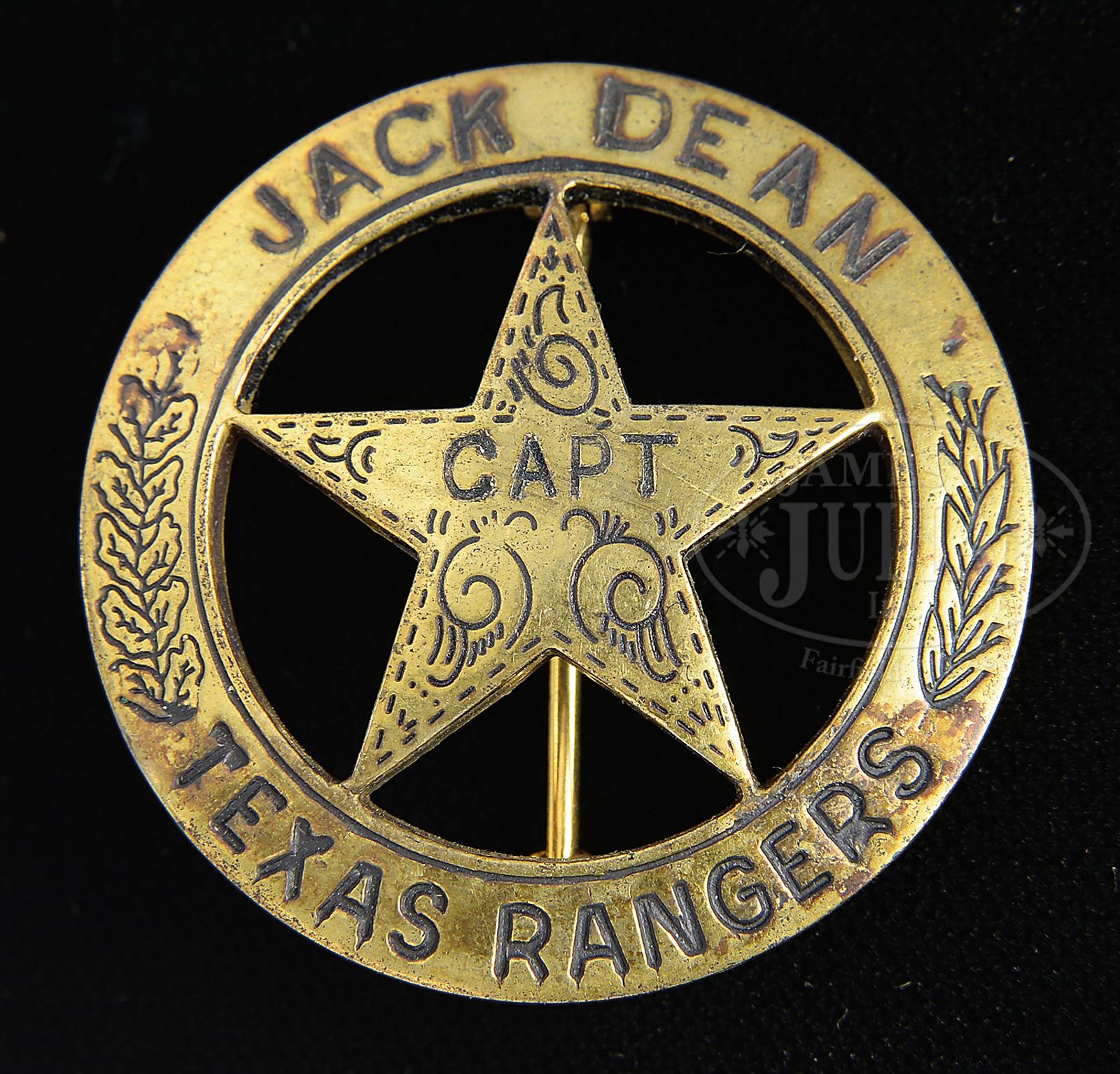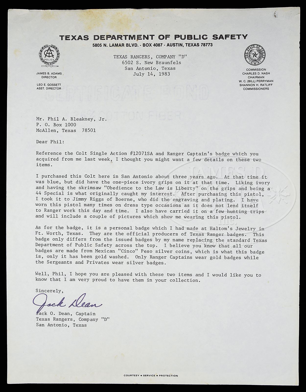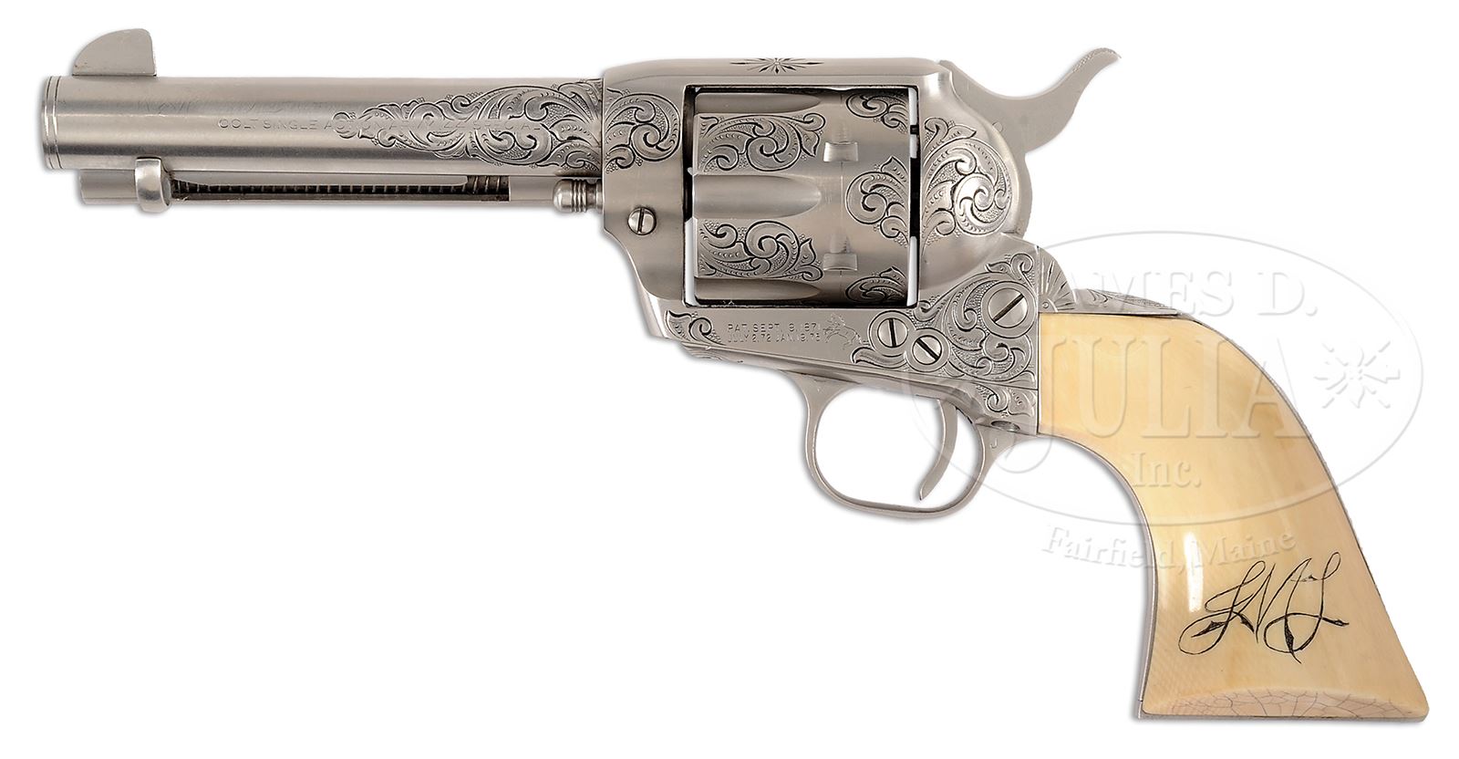 *INSCRIBED COLT SINGLE ACTION ARMY REVOLVER 2ND GENERATION CUSTOM ENGRAVED WITH SCRIMSHAWED ONE-PIECE IVORY GRIP ACCOMPANIED BY AN ORIGINAL GOLD-WASHED CINCO PESO TEXAS RANGER CAPTAIN’S BADGE WITH “JACK DEAN” ON TOP OF CIRCLE. PAPERWORK TO SUPPORT OWNERSHIP OF BOTH ITEMS BY RANGER DEAN.SN 12071 SA. Cal. 44 SPECIAL 4-7/8″ bbl, satin nickel finish, scroll engraved, one-piece scrimshawed ivory grip. Badge is made from a cinco peso Mexican silver coin that has been gold-washed. Badge was made at Haltom’s Jewelry in Fort Worth, Texas. Badge bears the name of Jack Dean above Captain on star and Texas Rangers on bottom of circle. “Certifiable pre-ban ivory” grips are scrimshawed “JML” on left side, and on right side with a banner saying “Obedience to the Law is Liberty” over an eagle’s head. Included is a letter from Captain Dean to Phil Bleakney dated July 14, 1983 describing this revolver and badge. Captain Dean states that he personally had the custom work done on the revolver, and that he used the revolver on dress occasions. It was his “parade gun”. However, the badge was his personal badge that he used in the Ranger service. Also included are two photographs taken at Ranger headquarters in Waco–one showing Captain Dean with Company D, and another showing Captain Dean that is autographed to Phil Bleakney. PROVENANCE: The Estate Collection of Phil A. Bleakney, Jr. Special Note: This item contains or is made of ivory. Do not bid on this lot unless you have read and agreed to our "Ivory Position Statement" and the "Waiver of Legal and Financial Risk to James D. Julia in regards to your Purchase of an Ivory Object." This information is located in the front section of our catalog. CONDITION: Very fine. Revolver retains 95% satin nickel finish overall. Revolver has been scroll engraved by Jimmy Riggs of Boerne, Texas. Engraving is of very good quality with about 50% coverage. Backstrap is inscribed “Capt. Jack Dean/CO. D. Texas Rangers”. Badge is in very good condition and shows wear to support its use in service. This cataloger is a personal friend of Captain Dean, and can state that this is a wonderful opportunity to obtain a Colt Single Action owned and used by a Texas Ranger along with a real Ranger badge that was used in his service as a Ranger Captain. 49059-193 TEP C&R; IVORY (4,000-8,000) – Lot 1067 Click here to view provenance