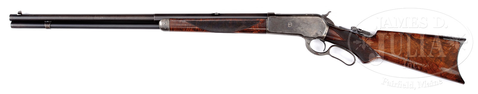 SCARCE SPECIAL ORDER DELUXE WINCHESTER MODEL 1886 LEVER ACTION RIFLE.SN 88345. Cal 45-90. Beautiful ’86 rifle with 26″ oct to rnd bbl, full magazine, tall sporting front sight with screw, Lyman 6A 2-leaf folding bbl sight and Lyman tang sight with folding aperture. Mounted with about 3X, center crotch, flame grain American walnut that has “H” style checkered forearm and serpentine grip buttstock with black insert in the grip cap and crescent buttplate. Left side of the lower tang, under the wood is marked with the assembly number “351” & “XX”. Matching assembly number is also found inside top tang channel of buttstock & inside toe of buttplate. This rifle was produced in about 1894 and undoubtedly was someone’s prized hunting rifle. This caliber was very accurate and capable of taking the largest North American game including Grizzly Bears, Moose and Elk and was an outstanding law enforcement or self-defense arm. CONDITION: Fine to very fine, all matching. Bbl & magazine tube retain about 95% orig blue turned somewhat dull with some extremely fine pinprick surface discoloration. Receiver retains traces of case colors being mostly a silver gray patina. Lever & hammer also retain light faded case colors. Wood is sound with handling & use nicks, scratches & dings, mostly on the surface only and overall retains about 95-96% orig piano varnish finish. Mechanics are fine, very bright shiny bore. 51378-4 JRL (12,500-17,500) – Lot 1067