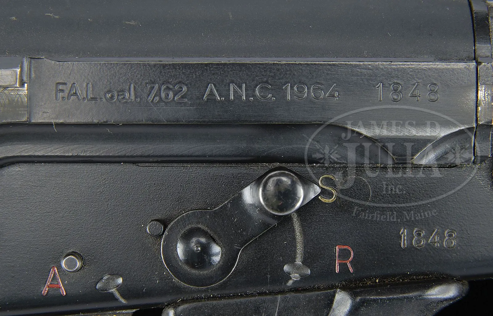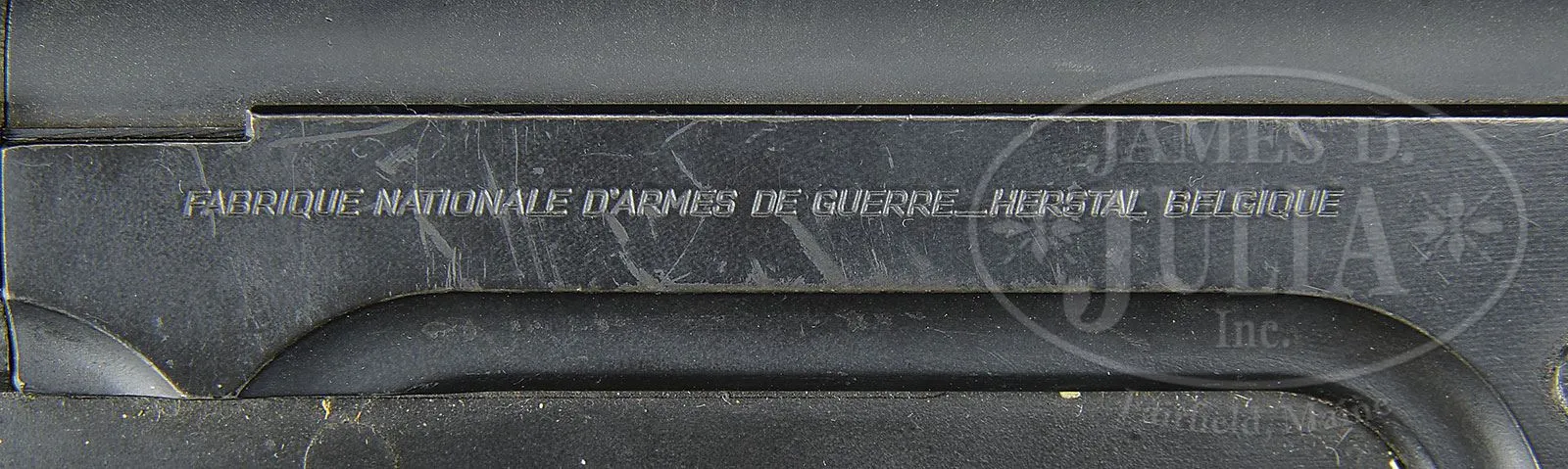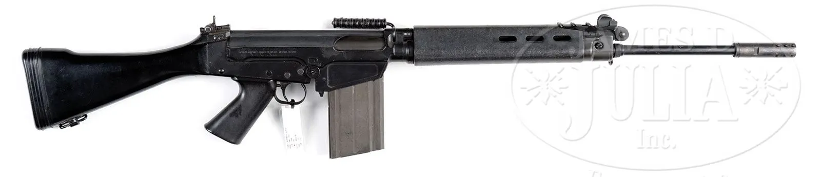 **FABRIQUE NATIONALE F.A.L. MACHINE GUN (FULLY TRANSFERABLE).SN 1848. 308 cal. 21″ bbl. Marked on left side of receiver “F.A.L. cal. 7.62 A.N.C. 1964” plus SN. Right side of receiver marked “FABRIQUE NATIONALE DE’ARMES DE GUERRE_HERSTAL BELGIQUE”. Numbers match between upper and lower. Selector operates for safe, semi automatic and full automatic. Includes carrying handle, muzzle break and sling swivels in its classic military configuration. Included in this lot is one 30 round magazine. Firing mechanism functions smoothly when operated by hand. This weapon appears fully functional. PROVENANCE: The class III weapons formerly on loan to Evergreen Aviation & Space Museum. CONDITION: Overall appearance and finish is extremely fine with over 95% orig finish remaining with some wear at the high points along with some scuff and scratches to bare metal. Composite hand guards, hand grip and buttstock in fine condition with some slight scratches and gouges but still very attractive. Bore is shiny and bright with some slight frosting. Muzzle break has some carbon buildup, green verdigris and some slight corrosion. This gun holds up and handles very well. 4-51757 JWK72 (14,000-18,000) – Lot 1068