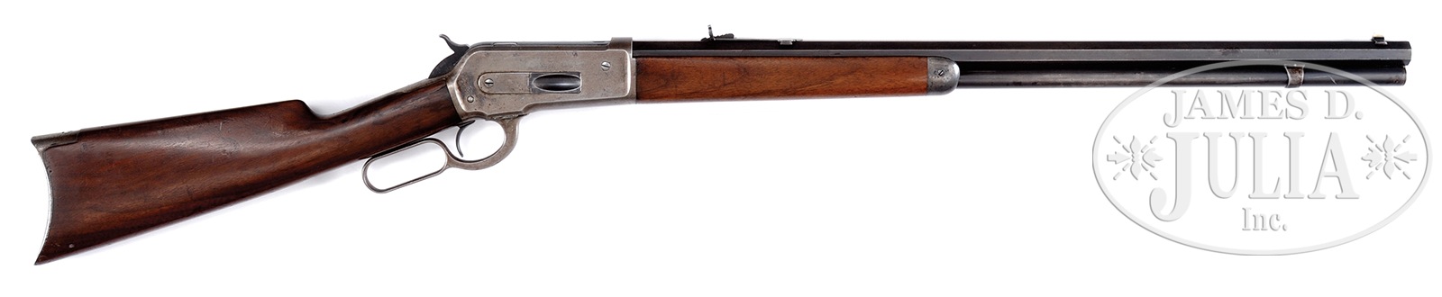 WINCHESTER MODEL 1886 OCTAGON BARREL FULL MAGAZINE SPORTING RIFLE WITH CASE COLORED RECEIVER.SN 97765. Cal. 40-82 WCF. 26″ Oct bbl full magazine. Blue & case colored finish. Straight grained American walnut stocks. Standard sights. CONDITION: Very good to fine. Bbl and magazine tube retain 80% of their fading blue finish with high point and muzzle wear and few small scratches. One small stain on right side of bbl and some erosion on the right side of magazine tube. Sights are good. Rear sight has been somewhat cleaned. Bore is frosty with strong rifling and some erosion toward the muzzle. Receiver retains 10-20% case color turning a silver-gray patina overall. Receiver has some carry wear. Lever and hammer are silver-gray patina with traces of case color in protected areas. Bolt retains 50% bright blue. Stocks are very good and full-sized with some slight marring and scratching overall. Buttplate shows a silver-gray patina as does the forend cap. A very nice example of a 86 Winchester rifle with a case colored frame in an excellent caliber. 49971-34 TEP (3,000-5,000) – Lot 1068 Click here to view provenance
