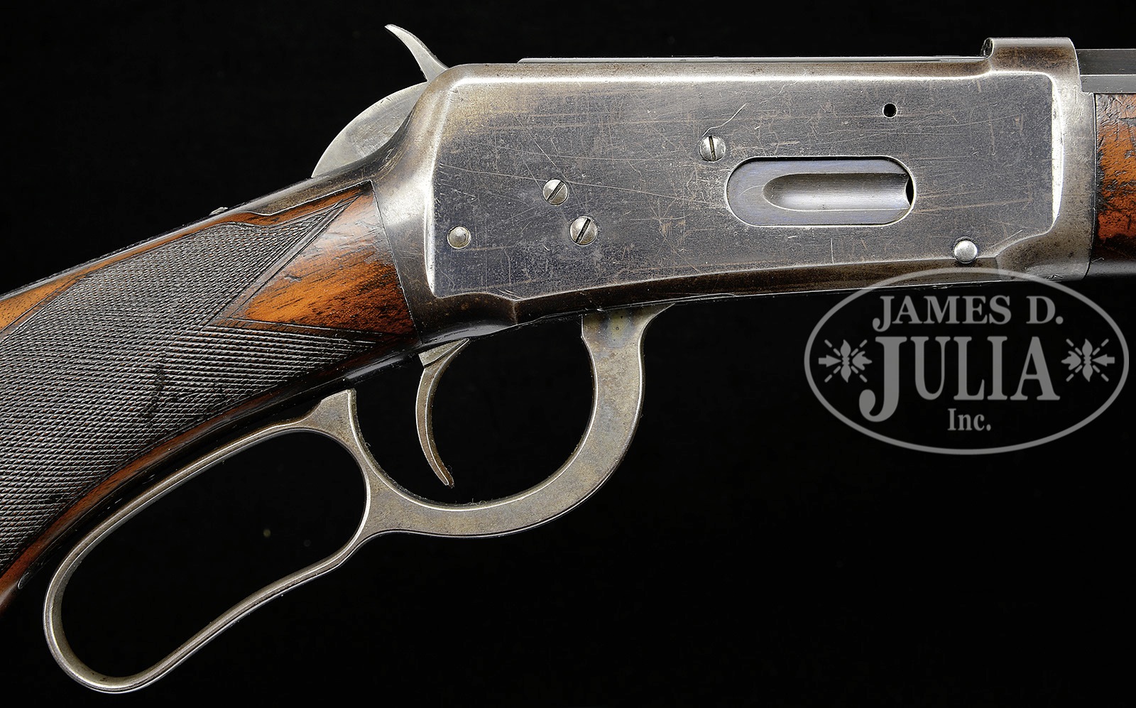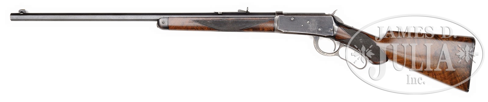 VERY RARE 1ST MODEL DELUXE WINCHESTER 1894 LEVER ACTION RIFLE.SN 4176. Cal. 38-55. Rare 1st model ’94 in very rare deluxe configuration with 24-1/4″ oct bbl, button magazine Sheared front sight and semi-buckhorn rear sight. Receiver has the exposed guide screw heads found only on the very early ’94s. These screws retaining the cartridge guides were attached toward the rear end of the guide that proved to be not very effective which allowed the guides to loosen. After a short production run the guide screws were inserted internally at about midpoint on the guide rails which system remains in production today nearly 120 years later. Left side of receiver is factory engraved with the intertwined initials “AJS” in Old English style. Mounted with 2-3X center crotch, flame grain American walnut with H-style checkered forearm and capped pistol grip buttstock that has Winchester hard rubber buttplate. Left side of lower tang, under the wood is marked with the assembly number “1820”, “XX” and “RB”. Matching assembly is also found in top tang channel of buttstock. Left side of upper & lower tangs, under the wood are also stamped “R.F. ENEWOLD” in tiny letters and again in larger letters on rear face of buttstock under the wood. Accompanied by a Cody Firearms Museum letter and a Cody Firearms Museum records office worksheet which identifies this rifle in caliber 38-55 with 24″ oct bbl, plain trigger, checkered pistol grip stock, stock 1″ short, 1/2 magazine, shotgun butt with rubber buttplate and engraved “AJS” on frame, received in warehouse April 8, 1895 and shipped the next day to order #9338. These early ’94s are rarely found with high orig finish. They were the first Winchesters chambered for the “new” higher velocity cartridges in a handy, lightweight rifle. They saw immediate acceptance from the buying public and have been employed as hunting & self defense arms ever since. According to Colt Peacemaker Encyclopedia, Cochran, R.F. Enewold was Robert F. Enewold of Reno, NV who was known to have regularly stamped firearms that passed through his shop with his name. A picture in the referenced publication on page 141 shows an identical stamping tothe one on this rifle. A Google search disclosed reports of several other firearms bearing the identical stamps. PROVENANCE: Tommy Rholes Estate Collection. CONDITION: Fine to very fine. Bbl retains about 95% orig blue with sharp edge wear, a few small nicks & slight dulling. Receiver retains 65-70% orig blue with candy striping on the sides and thinning over the top & bottom. Hammer retains bright case colors and the lever bright case colors in sheltered areas. Wood is sound with usual nicks & scratches, a few light bruises in the checkering & overall retains about 95% orig varnish. Buttplate has a couple small chips in the toe not affecting the wood. Mechanics are fine. Bright shiny bore. 4-50558 JR45 (20,000-30,000) – Lot 1070