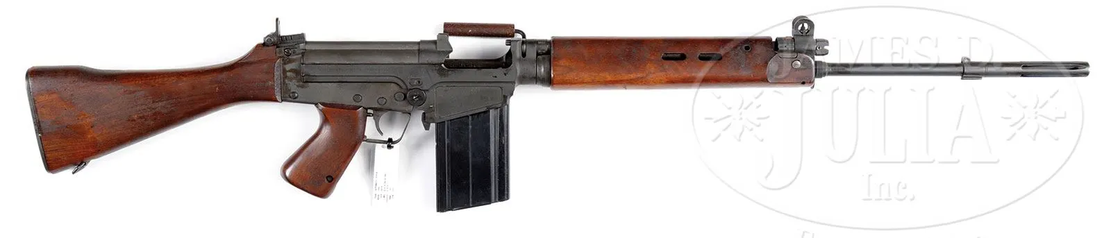 **HARRINGTON & RICHARDSON MODEL T48 (C&R).SN 4478. 308 cal. 24″ bbl. This Harrington & Richardson T-48 rifle is the American made counterpart to the FN-FAL and retains its arsenal eagle under 3 star cartouche on left side of buttstock. Marked on right side of receiver “RIFLE CAL .30 T48/4478”. Left side of receiver marked “HARRINGTON & RICHARDSON INC., WORCESTER, MASS.” One 20 round magazine is included in this lot. Firing mechanism functions smoothly when operated by hand. This weapon appears fully functional. PROVENANCE: The class III weapons formerly on loan to Evergreen Aviation & Space Museum. CONDITION: Overall appearance and finish extremely fine with over 98% of a smooth gray parkerized finish remaining with the only loss being at the high points and where the charging handle touches the receiver. Wood has some handling marks along with a couple of dings and scratches and some areas of stickiness where the oil in the wood probably came to the surface when the gun was in the sun and then congealed upon cooling. Bore is shiny and bright with some light pitting in the grooves. There are some remnants of white paint on the left side of the hand guard. This will be a great specimen for the modern machine gun collector. 4-51755 JWK71 (18,000-22,000) – Lot 1070