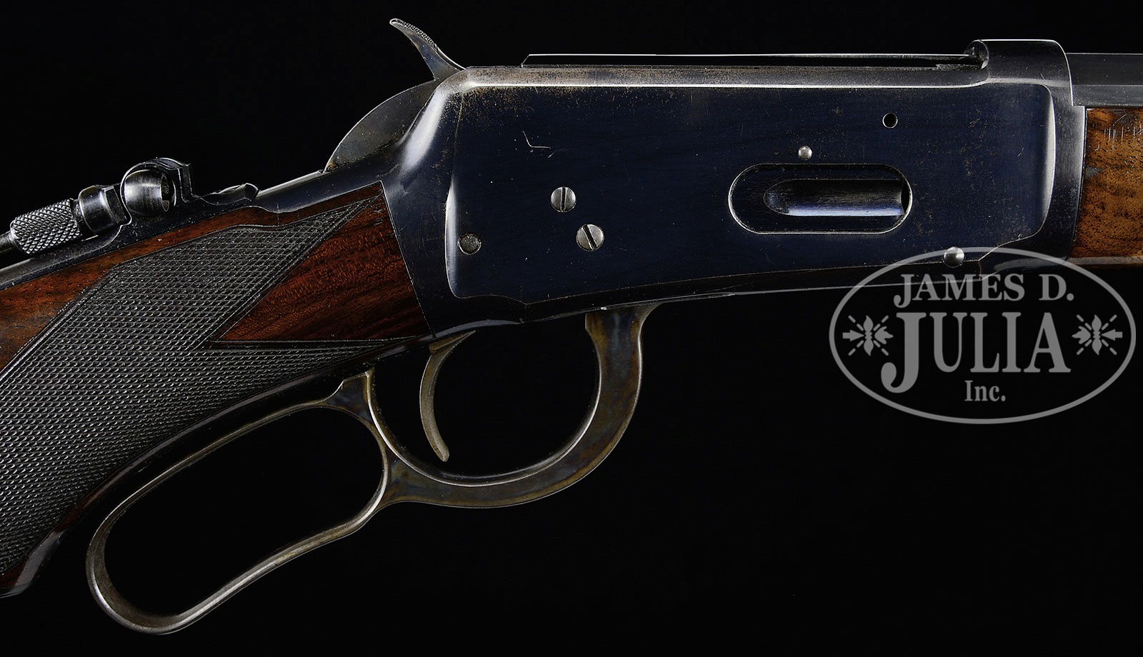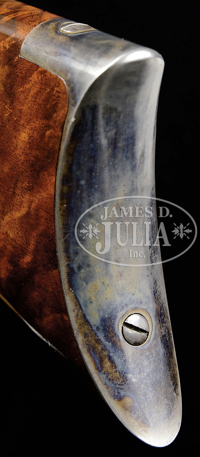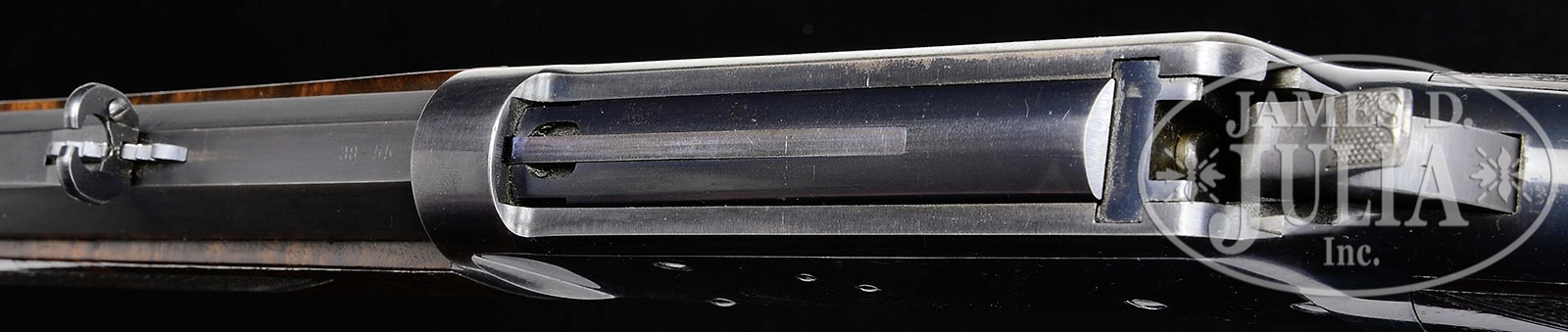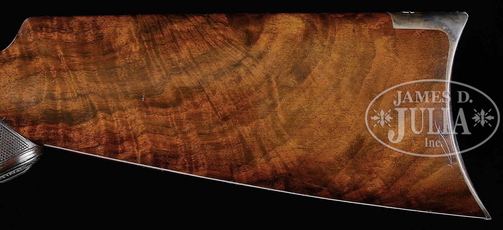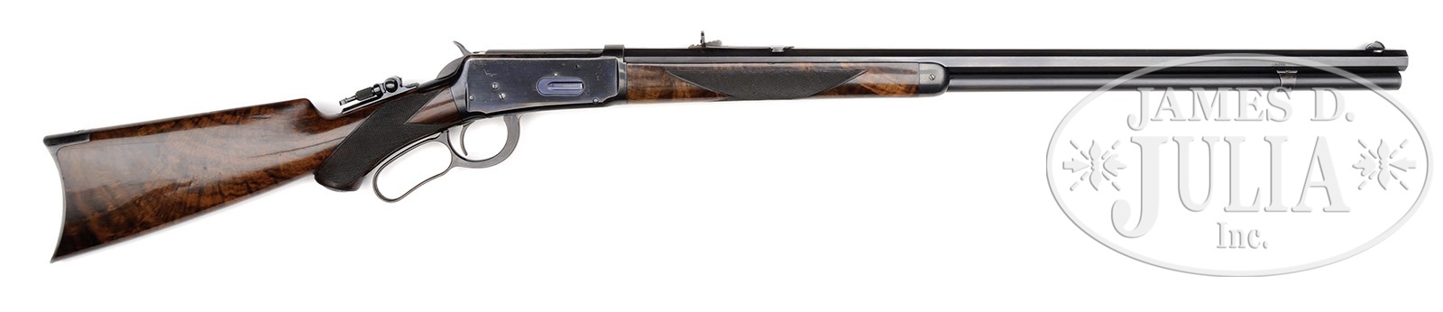 SN 10686. Cal. 38-55. Beautiful deluxe ’94 with 26″ oct bbl, full magazine, Lyman ivory bead hunting front sight, full buckhorn rear sight and Lyman combination tang sight. Mounted with about 3X plus center crotch, flame & burl grain American walnut with H-style checkered forearm and capped pistol grip buttstock that has crescent buttplate. Left side of lower tang, under the wood is marked with the assembly number “2408” and “XXX”. Matching assembly number is also found in top tang channel of buttstock and inside toe of buttplate. The number in the top tang channel is correct and orig but, unusually stamped upside down. Accompanied by a Cody Firearms Museum letter which identifies this rifle in caliber 38-55 with oct bbl, plain trigger and checkered stock with pistol grip, received in warehouse Nov 21, 1895 and shipped Nov 26, 1895 to order #1022. Also accompanied by a copy of a page from the Winchester shipping records with the entry for this rifle highlighted. PROVENANCE: Tommy Rholes Estate Collection. CONDITION: Extremely fine, all matching. Bbl and magazine tube retain 98-99% strong orig blue with only faint sharp edge wear around the muzzle and one or two tiny nicks. Receiver retains 96-97% strong orig blue with light sharp edge wear, some minor flaking and slight thinning on the bottom at the carry point. Lever & hammer retain brilliant case colors, lightly faded on outer faces of lever. Buttplate retains 95-96% bright to brilliant case colors. Wood is sound with a few light nicks and scratches and overall retains about 98% crisp, orig piano varnish finish. Mechanics are crisp. Brilliant shiny bore, may have been fired but if so, very little. 4-50750 JR43 (15,000-25,000) – Lot 1071