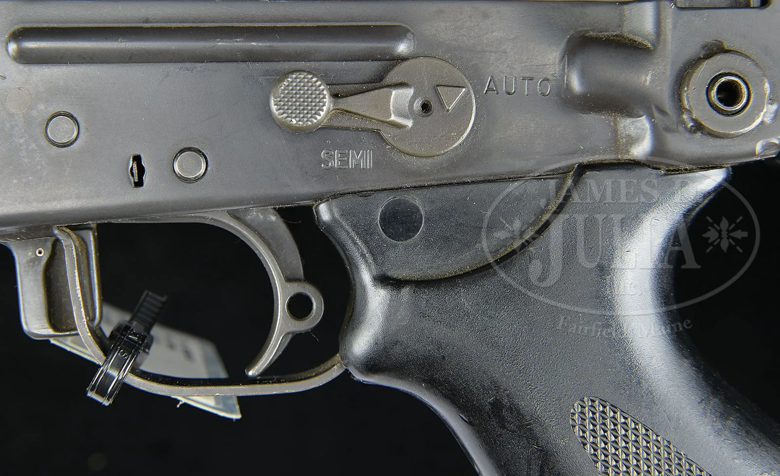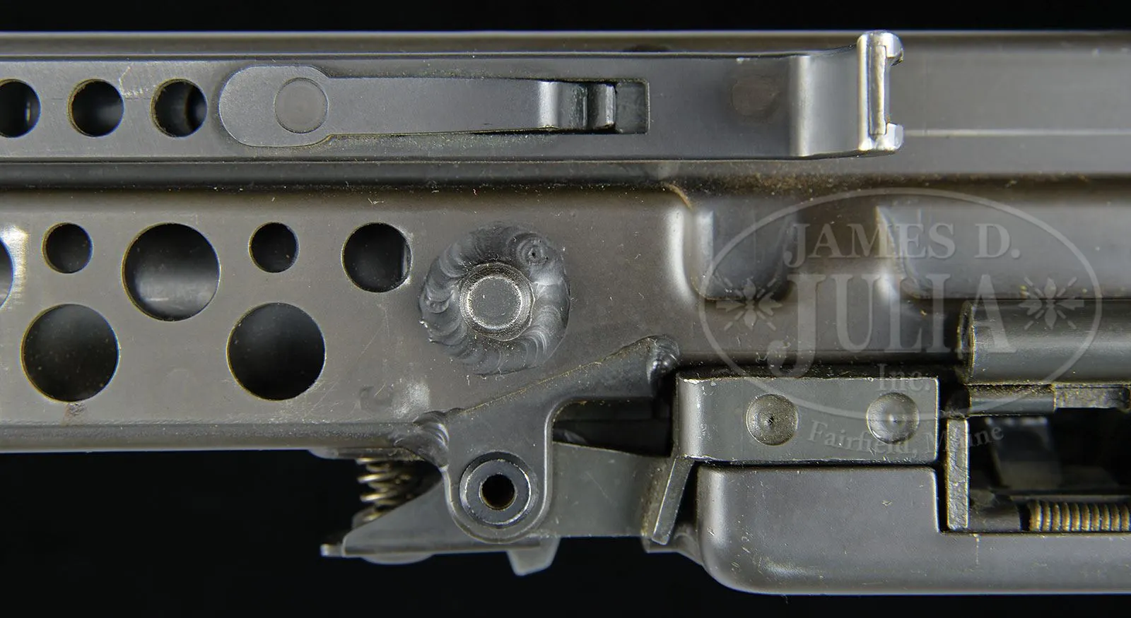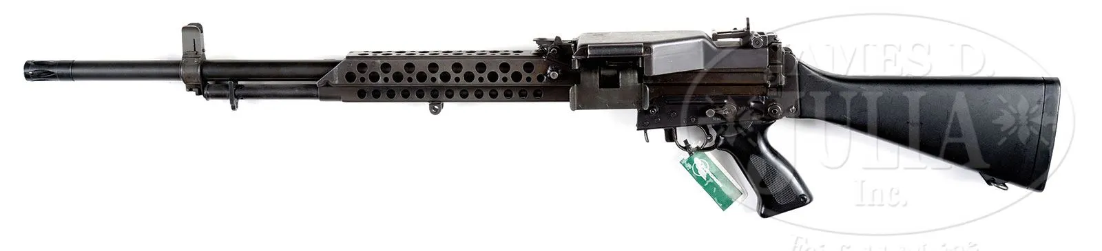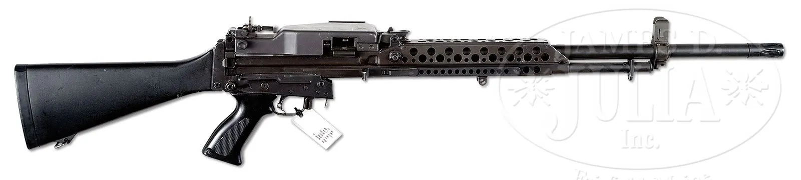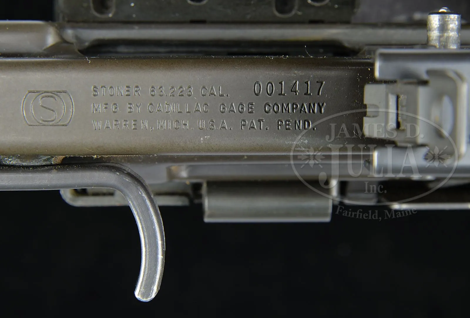 **EXCEEDINGLY RARE AND HIGHLY DESIRABLE CADILLAC GAGE STONER MACHINE GUN (C&R).SN 001417. 5.56 mm. 21-1/2″ bbl. This is one of the very few Cadillac Gage manufactured Stoner Model 63s in the registry. This all orig gun is marked on bottom of receiver “STONER 63.223 CAL.” / “MFG BY CADILLAC GAGE COMPANY” / “WARREN,MICH. U.S.A. PAT. PEND.” Also the Stoner logo at left of markings. Mechanism functions smoothly when operated by hand. Feed levers and springs all function properly. This gun appears fully functional. PROVENANCE: The class III weapons formerly on loan to Evergreen Aviation & Space Museum. CONDITION: Overall finish and appearance is near excellent with over 95% orig smooth gray finish thinning at 2″ intervals on bbl protective shroud. Also some small scuff marks and handling marks to hand grip and buttstock. Top cover also has some small scratches. Feed tray retains about 60% of its orig finish with finish thinning in feedway. Bore is shiny, bright and clean with strong rifling. Bolt face is excellent. All orig Stoner guns almost never surface for sale and this is an outstanding opportunity for either the private collector or the museum to acquire an example of this landmark design. 4-51787 JWK50 (75,000-125,000) – Lot 1071