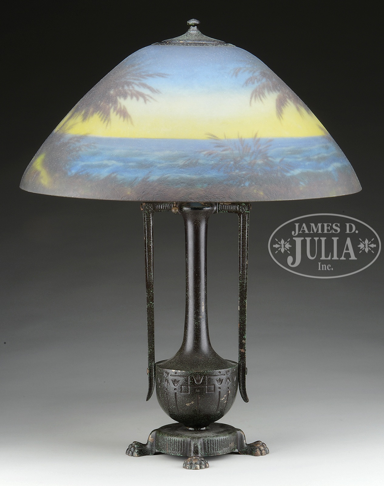 MOE BRIDGES TROPICAL SCENE TABLE LAMP.Moe Bridges table lamp has reverse painted nighttime scene of palm trees at oceans edge with full moon peeking through palms against a yellow shading to dark blue nighttime sky. Reverse of shade is painted with 2 palm trees on an outcropping at oceans edge against same sky. Signed on bottom edge of shade “Moe Bridges Co 200”. Shade rests on an urn shaped base with square handles and a platform with 4 lions paw feet. Base has 2 socket cluster and original cap. Base has a dark brown finish with green spatters. Signed on underside “Moe Bridges Co Milwaukee Wis”. SIZE: Shade 17-7/8″ dia. Lamp 23″ t. PROVENANCE: Dean & Kate Armstrong Collection. CONDITION: Shade has some oxidation to paint on interior, otherwise very good. Base is very good with some wear and discoloration to finish. 49719-5 (1,500-3,000) – Lot 1072