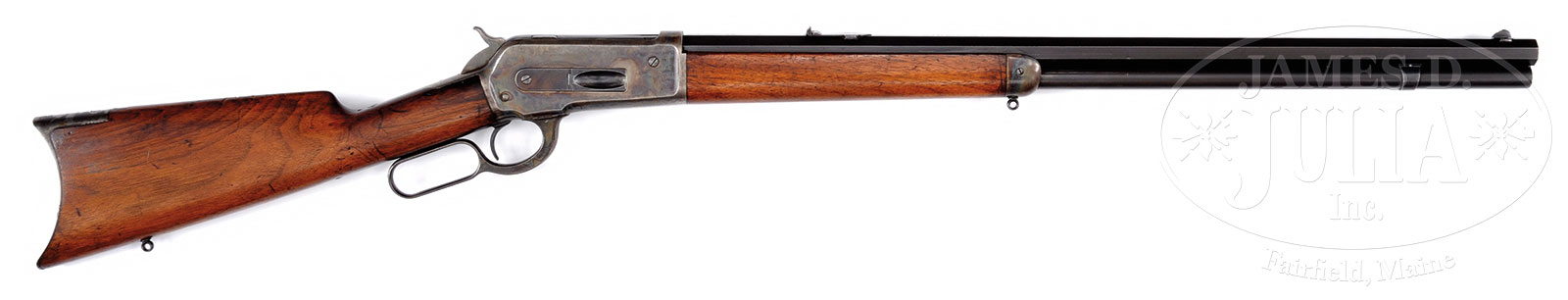 SCARCE WINCHESTER MODEL 1886 BIG 50 LEVER ACTION RIFLE.SN 96227. Cal 50 EX (50-110). Standard grade rifle with 26″ oct bbl, full magazine, Lyman hunting front sight and 3 leaf platinum line express rear sight. Receiver, forend cap and buttplate are color case hardened. Mounted with uncheckered straight grain American walnut with straight stock & crescent buttplate. Buttstock & forend cap have sling eyes. Accompanied by a full box of Winchester 50-110 EX ammunition. Box has round corners with green & black label and is marked “To be used in Winchester Model 1886 rifles”. Ammunition has 300 grain soft point bullets and has the head stamp “50-110 EX.” Also accompanied by 4 rounds of reloaded 50-110 ammunition in “CCC” brass cases with cast lead bullets. This rifle was produced at about 1895 at a time when hunting for subsistence and market hunting was a way of life. The Big 50 was designed to be effective for all North American big game including the Grizzly Bear, Elk & Moose and anything else the shooter wished to shoot. Firearms of that era, especially hunting arms usually saw extensive hard service and are rarely found today with high orig finish. Color case hardening when exposed to ultraviolet rays of sunlight fades rather rapidly. This rifle is somewhat unusual with crescent buttplate as most of the Big 50’s were sold with shotgun buttplates. Shooting one of these big bores with a crescent buttplate is a near religious experience. CONDITION: Very fine. Bbl retains 95-96% strong orig blue with only light sharp edge wear. Magazine tube retains about 95% orig blue with a few small scratches. Receiver retains virtually all of its orig case colors, strong & bright especially on the left side and over the top. Right side & belly of the receiver are moderately faded. The 2nd lacquer coat lines are still visible on belly of the receiver. Lever & hammer retain strong case colors, bright on right side of lever, moderately faded elsewhere. Forend cap retains strong bright case colors around the rear half with the balance fading to silver. Buttplate is a silver/brown patina. Top & bottom tangs are mostly a gray patina. Stock has a hair line in the left wrist with some light oil staining around receiver with light handling & use nicks & dings and retains most of its orig oil finish. Mechanics are crisp, brilliant shiny bore with some minor rust spots about 4″ from the muzzle. Box has small repaired seams at each end of the bottom, otherwise is completely sound. It shows heavy soil with edge wear & some light losses on top of the lid. Ammunition is lightly to moderately oxidized with a couple of minor handling dings. 51570-2 JRL (8,000-12,000) – Lot 1073 Click here to view provenance