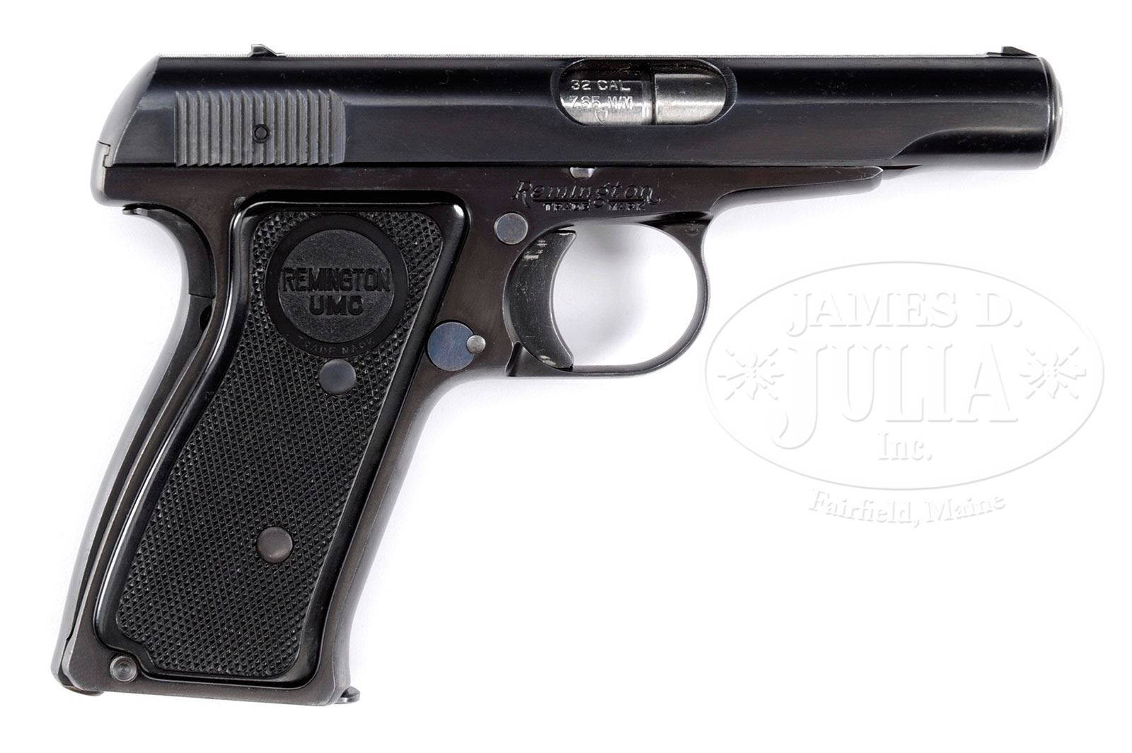 *SCARCE REMINGTON MODEL 51 SEMI-AUTO PISTOL.SN PA68545. Cal. .32 ACP. Blue finish with 3-1/2″ bbl, fixed sights and “REMINGTON / UMC” trademark embossed, checkered hard rubber grips. Accompanied by one orig magazine marked “32 CAL”. Although the Model 51 was manufactured in fairly large numbers, it is believed that those in Caliber .32 are substantially more scarce. These pistols usually saw hard service in close proximity to body moisture in shoulder or hip holsters or simply in someone’s pocket, and are rarely found with high orig finish. PROVENANCE: The Elliott Burka Estate Collection. CONDITION: Extremely fine+, overall retains 99%+ crisp orig blue with only a few scattered, tiny spots of surface etching. Grips & magazine are equally new. Mechanics are crisp, brilliant shiny bore appears to be unfired. 4-56523 JR102 (2,000-3,000) – Lot 1074