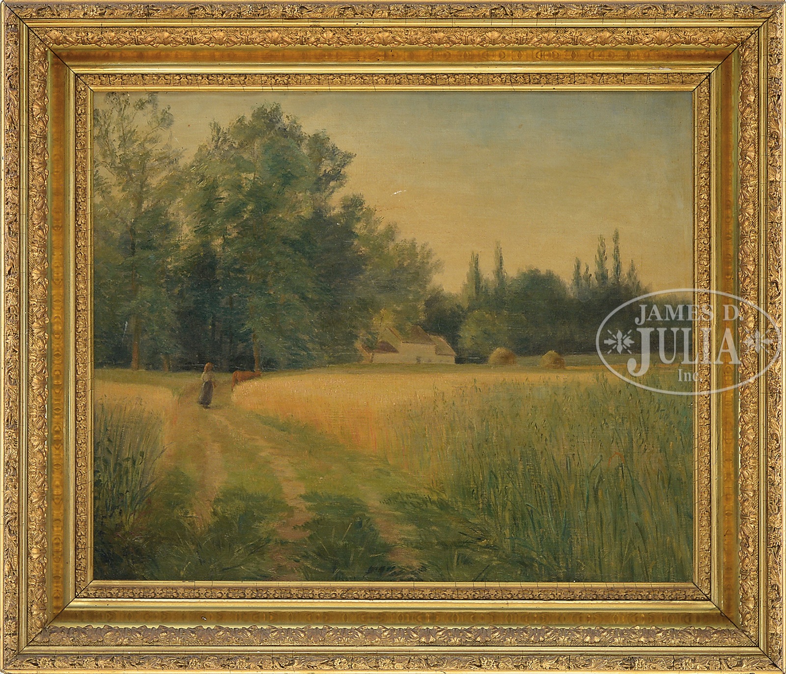 CARRIE EASTMAN RICHARDSON (American, 19th/20th century) FRENCH LANDSCAPE and MAINE LANDSCAPE.Including: 1) “Woman in a Landscape, Moigny, France”, oil on canvas, housed in a period giltwood frame, inscribed on verso “Painted in Moigny France 1894 by Carrie Eastman Richardson” 2) “View of Long Lake, Bridgton, ME”, oil on panel, housed in a simple giltwood frame, unsigned, inscribed in pencil on verso “Painted by Carrie Eastman Richardson/Bridgton, ME 1898″ SIZE: 1) 18″ x 22″. Overall: 24″ x 27-1/2″. 2) 10″ x 17”. Overall: 12″ x 19″ CONDITION: 1) Discolored varnish, canvas buckle and surface scratch in sky. 2) Horizontal band of cellophane tape along top visible, surface scratch in sky. Frame has gilt loss, tape residue, and nail holes. 50339-6 (800-1,200) – Lot 1074