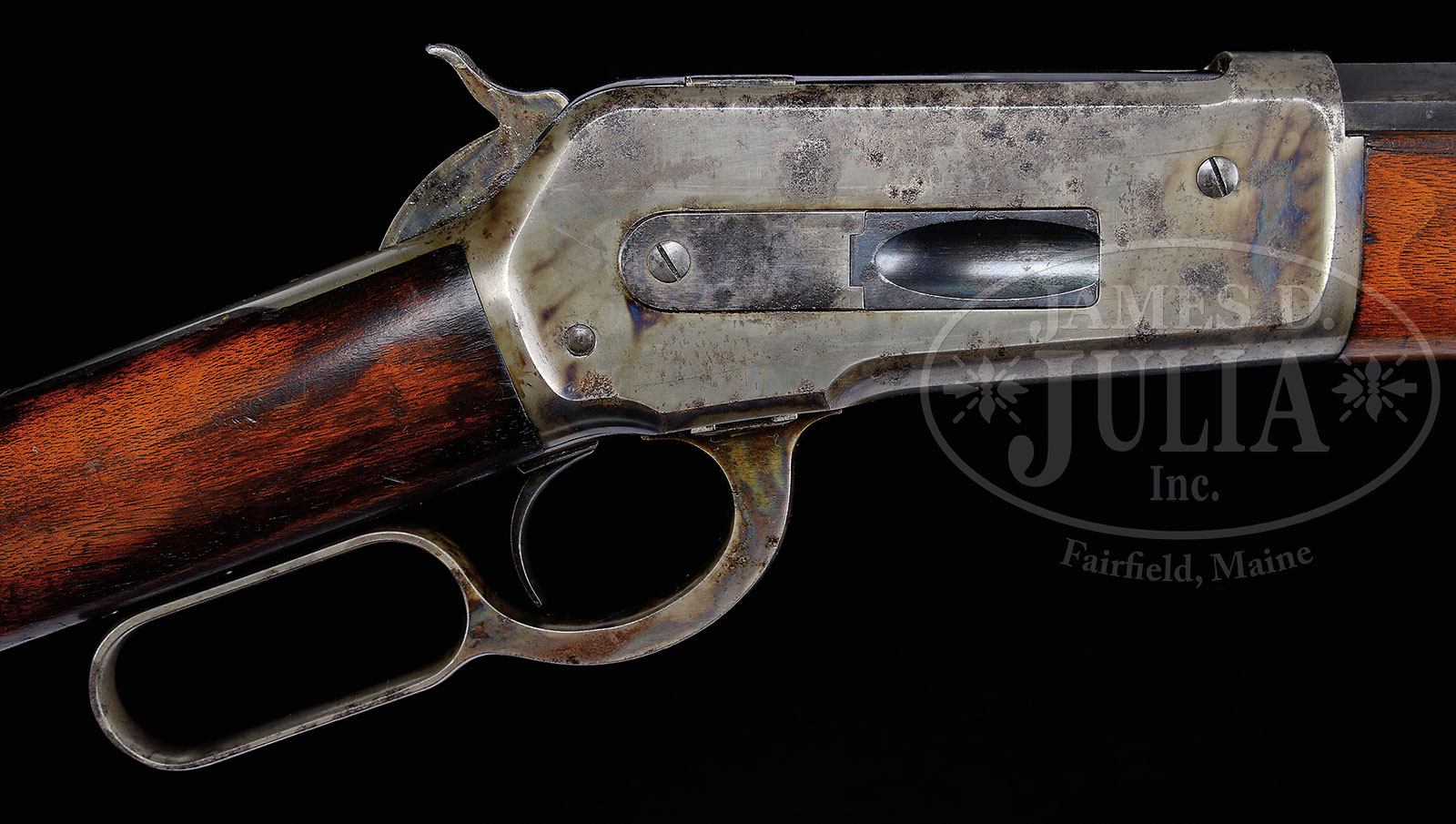 SUPERB CASE COLORED ANTIQUE WINCHESTER 1886 RIFLE.SN 77663. Cal. 45-70. 26″ oct bbl with nickel silver bladed sporting front sight and “1886” dated sporting folding staff rear sight. Bbl has traditional 2-line Winchester address on top bbl flat. Marked “45-70″ on top flat over chamber. Case colored receiver, hammer, finger lever, buttplate and forend cap. 2-pc nicely figured walnut stocks with crescent butt. Manufactured 1893 and is accompanied with factory letter verifying this configuration. CONDITION: Fine overall condition, with much factory blue finish remaining with several areas of finish loss now turning plum on muzzle of bbl and 12″ from muzzle on right side bbl flats. All corners of oct flats are sharp and fine. Full length tube magazine has slight pitting encompassing the last 4”, but has aged very well and now is rather plum overall. Case colored solid receiver has strong vivid case colors with area of darkening and light pitting on right side of receiver above loading gate assembly. Left side of receiver and top of chamber are excellent with vivid case colors and much factory lacquer remaining with some very minor lacquer loss and several very small areas of slight pitting. Upper and lower tangs are exceptionally fine with most all slightly fading case colors remaining. Walnut forearm is very fine with several small bruises on right hand side that are now slightly oil darkened but most all factory varnish remains. Buttstock very fine with several small bruises at wrist and several compression scratches towards crescent butt. An area of oil staining is present surrounding upper tang and climbing onto comb. This is a very pleasant and fine overall antique 1886 rifle with excellent bore and mechanics. 51591-5 (8,000-12,000) – Lot 1074 Click here to view provenance