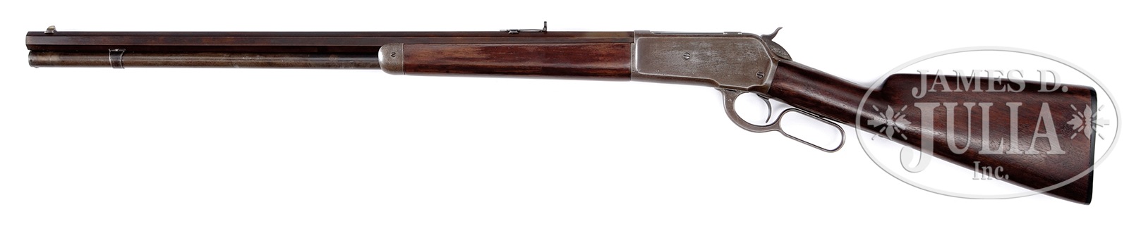 WINCHESTER MODEL 1886 OCTAGON BARREL FULL MAGAZINE SPORTING RIFLE WITH WINCHESTER HARD RUBBER SHOTGUN BUTTPLATE.SN 113610. Cal. 45-70. 26″ bbl. Blue finish. Straight grained American walnut stocks. Blade front sight and Marbles rear sight. Straight grained American walnut stocks with Winchester hard rubber buttplate. CONDITION: Good. Bbl has a brown re-finish overall with high point wear and some cleaning at the breech end. Bbl address is sharp. Cal. mark is a re-stamp. Sights are very good. Bore is bright with strong rifling. Receiver is gray-brown patina overall with some erosion on left side and top. Bolt shows gray-brown patina. Hammer screw is a replacement. Hammer and lever are a gray-brown patina. Stocks are very good with an old re-varnish finish over some mars and scratches. Buttplate is very good with sharp checkering and clear logo. Forend cap is a gray-brown patina. A good 86 Winchester in a popular caliber. 49971-39 TEP (2,000-3,000) – Lot 1076