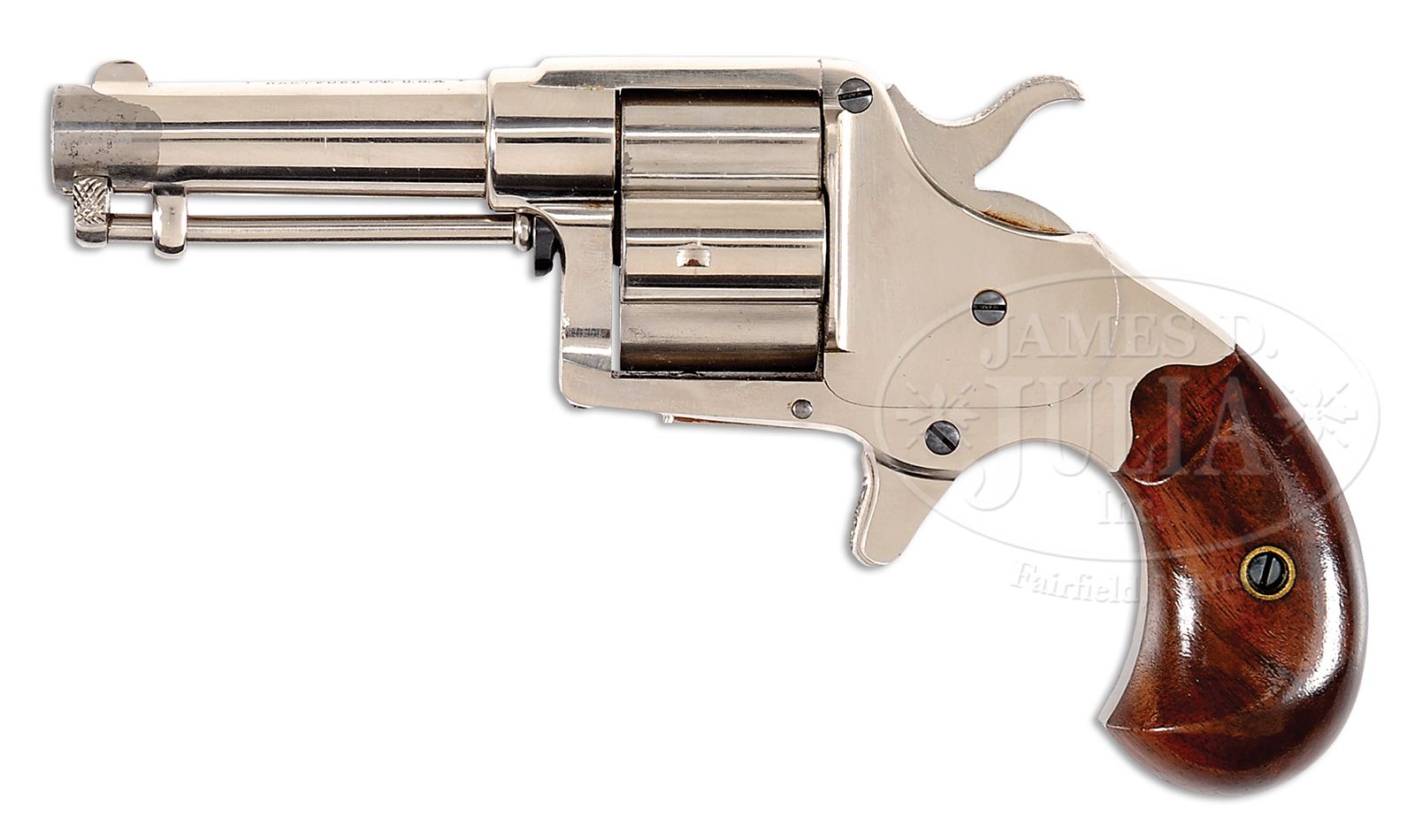 SCARCE COLT CLOVERLEAF HOUSE PISTOL.SN 5468. Cal. 41 RF. Nickel finish with 3″ rnd bbl, integral pinch blade front sight & 2-line address. Sight groove in top strap has the 1871 patent date. Cylinder is unusual with 4 chambers made in four leaf clover pattern. Mounted with 2-pc smooth bird head grips matching numbered to this revolver. Bottom of bbl has an attached ejector pin. There were about 9950 of these revolvers produced in 3 different variations in the period 1871-1876. These little revolvers were quite popular as hideout guns for their compact size and reasonably power cartridge. They are rarely found today with high orig finish, with most having seen hard service. PROVENANCE: The Estate Collection of Phil A. Bleakney, Jr. CONDITION: Extremely fine plus, all matching. Overall retains 97-98% crisp, orig nickel with the only loss slight flaking around the muzzle. Appears to be new and unfired. Grips are crisp & new with only faint sharp edge wear. Mechanics are very stiff, probably from old dried grease, but function well. Brilliant shiny bore. 49059-129 JR (1,500-2,500) – Lot 1077