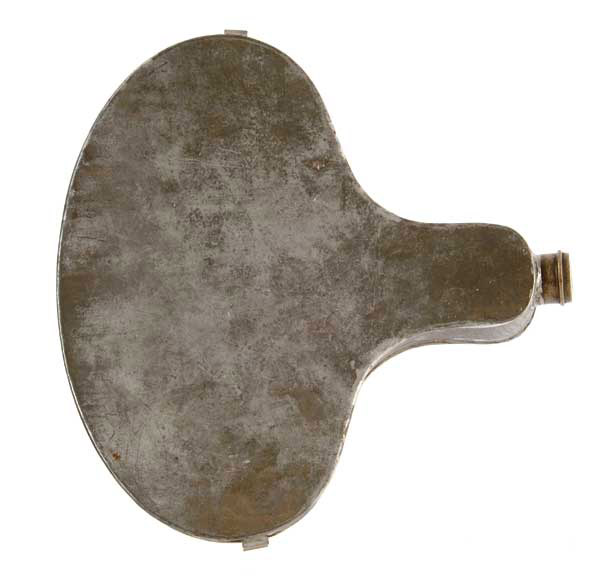 TIN CANTEEN. 9″ x 9″ kidney-shaped canteen with brass screw top. CONDITION: Generally fine. FS796 4-47582 (100-200)