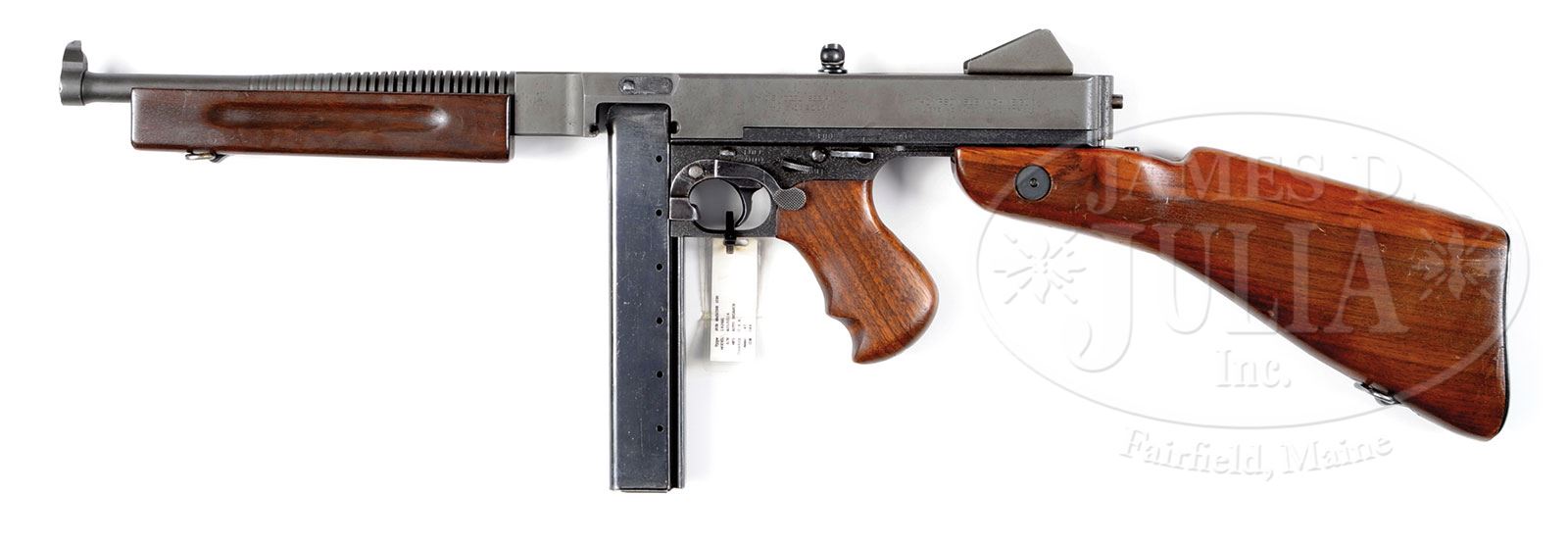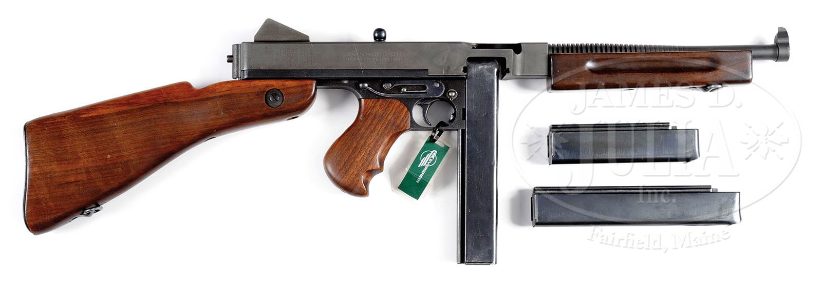 **US MODEL 1928 A1 THOMPSON BY AUTO-ORDNANCE, BRIDGEPORT (C&R).SN A0102114. 45 cal. 10-1/2″ bbl. This Thompson 1928 A1 has horizontal forend, no compensator and fixed peep sight. The left hand ear of the cocking handle is broken off. Otherwise, the gun is complete and comes with one 20 round magazine marked “AUTO-ORDNANCE” and two 30 round magazines marked “US 30 CARTRIDGE CO.” SNs on upper and lower assemblies do not match; lower SN is S-388493. Firing mechanism functions smoothly when operated by hand. This weapon appears fully functional. PROVENANCE: The class III weapons formerly on loan to Evergreen Aviation & Space Museum. CONDITION: Overall appearance and finish is 95% as refinished. Upper has a smooth gray parkerized finish over fairly heavy pitting over all parts of the receiver. It appears that at one time there was a crack in the receiver to the rear of the ejection port which has been re-welded and finished over. Lower also retains over 95% of a black refinish over fairly heavy pitting. Wood has also been refinished and has some slight dings, nicks and handling marks. Bore is shiny and bright and clean. Bolt face is extremely fine. Magazines are very clean and have in the high 90s percentile of orig finish. This will be an absolutely great gun to take to the range and shoot to your heart’s content. 4-51762 JWK74 (18,000-22,000) – Lot 1078