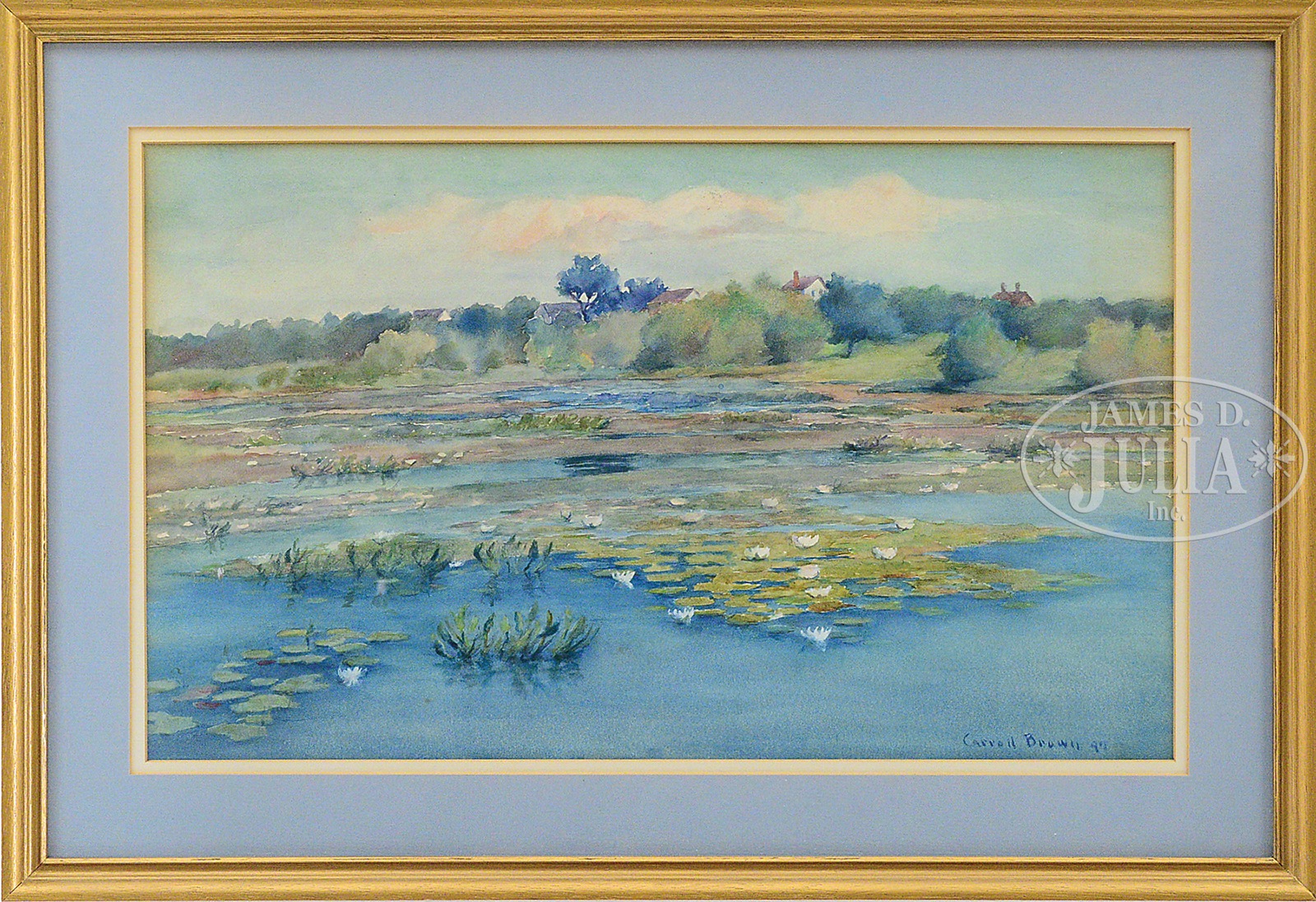 CARROLL BROWN (American, 1862-1923) “POND LILIES”.Watercolor on paper Housed in a giltwood frame with double mat Signed and dated lower right “Carroll Brown ’97” Exhibited: John Levy Galleries, New York. “Memorial Exhibition of Paintings by Carroll Brown”, February 25-March 8, 1924. Note: This lot accompanied by a photocopy of the pamphlet from the above mentioned exhibition. SIZE: Sight size: 11″ x 18-1/2″. Overall: 16-1/4″ x 24″ PROVENANCE: Kathryn Brown (sister-in-law of the artist); By descent through the family CONDITION: Good with mat burn along edges, not examined out of frame 49720-3 (1,000-2,000) – Lot 1078