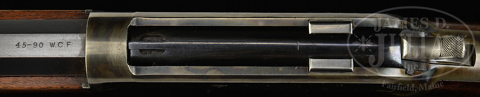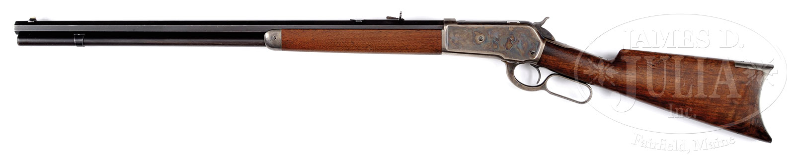 WINCHESTER MODEL 1886 LEVER ACTION RIFLE.SN 49202. Cal 45-90. Standard grade rifle with 26″ oct bbl, full magazine, half nickel front sight & semi-buckhorn rear sight. Mounted with uncheckered straight grain American walnut with straight stock & crescent buttplate. Accompanied by a Cody Firearms Museum letter which identifies this rifle in cal 45-90 with oct bbl, plain trigger. Received in the warehouse November 18, 1890 and shipped April 18, 1891 with 7 other Models 1886 to order number 34141. Also accompanied by a full orig box of Winchester 45-90-300 ammunition. Box has a green & black label with square corners and has patent date of Dec 14 1886. Ammunition is original with soft point bullets. Given the large order it seems likely that these rifles were ordered for a ranch, mine, bank or rail security. In either case they would have seen hard service probably with limited maintenance. CONDITION: Very good to fine. Bbl retains about 90% strong orig blue with sharp edge & muzzle end wear. Magazine tube retains about 90% orig finish turning dull & plum colored. Receiver retains about 60-70% orig case colors, strong on the sides turned silver on the belly. Hammer retains bright case colors and the lever fading case colors on the sides turned silver elsewhere. Forend cap retains smoky case colors and the buttplate has turned silver. Wood is sound with numerous light nicks & scratches and shows a hand worn patina. Mechanics are crisp, very bright shiny bore. Box has 3 open edges and shows worn edges with moderate staining and some minor losses to the label. Ammunition is crisp & clean showing light oxidation. 51570-3 JRL (4,000-7,000) – Lot 1078 Click here to view provenance