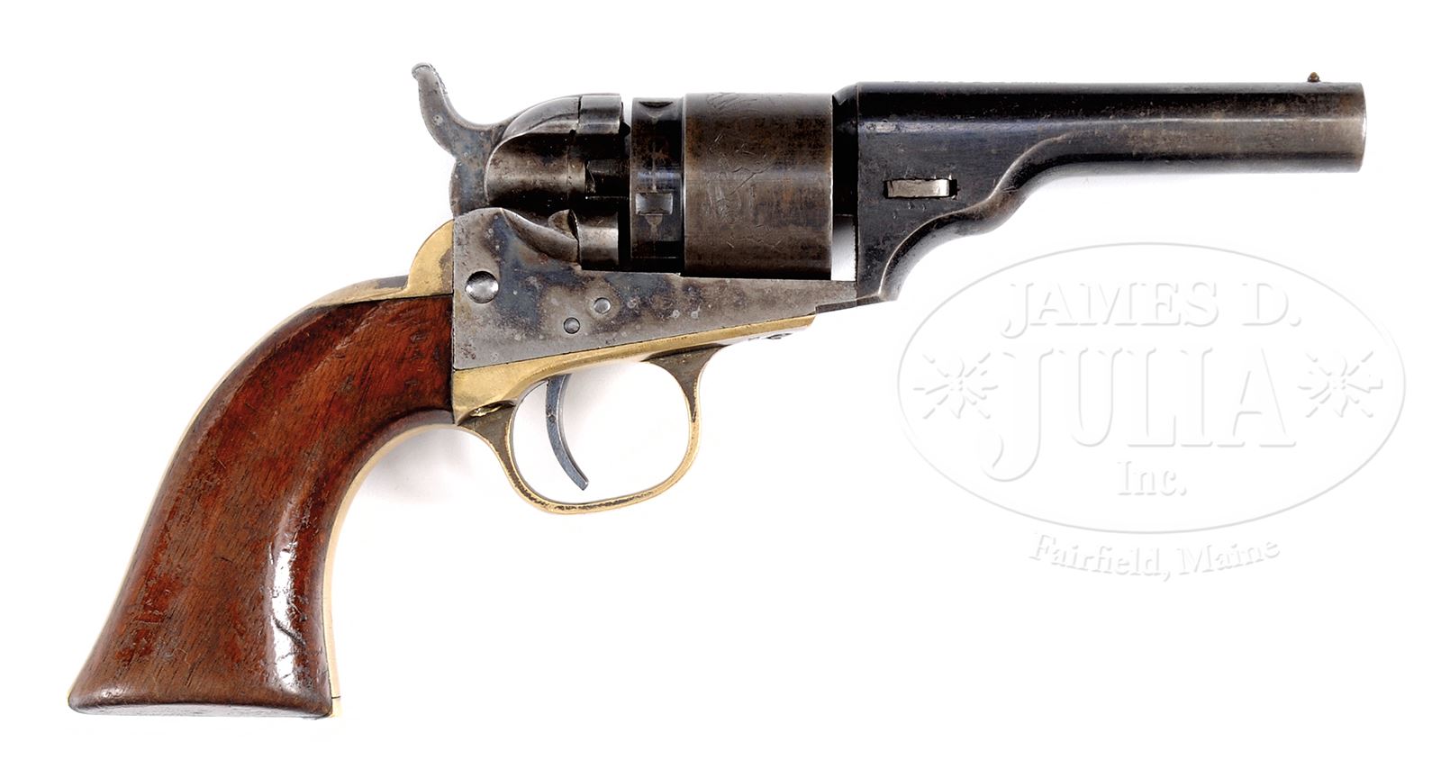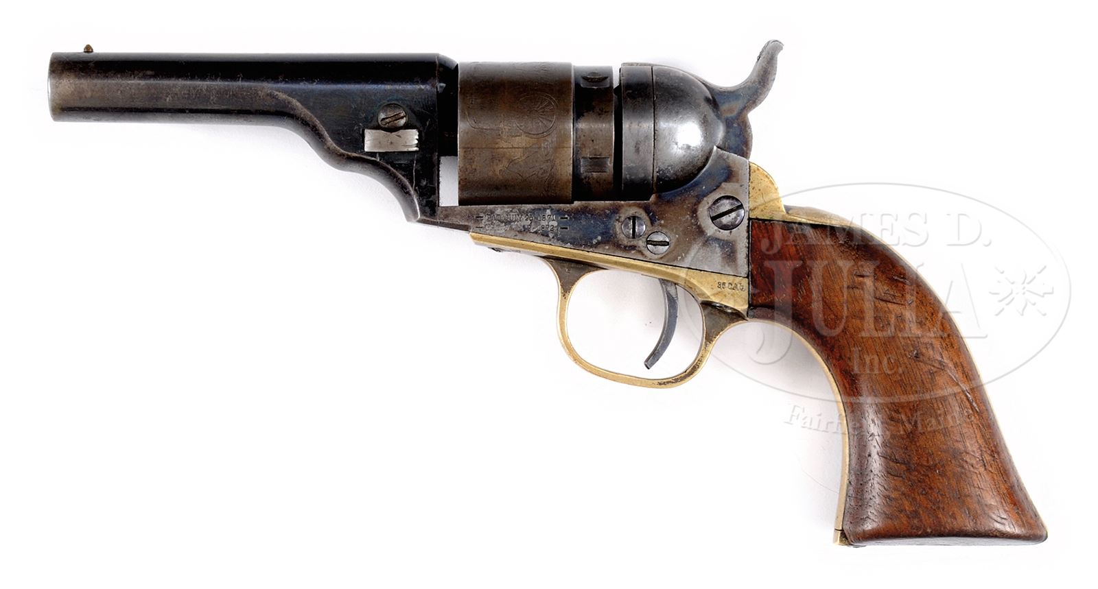 SN 313254. Cal. 36 3-1/2″ bbl, blue and case colored finish, walnut grips. PROVENANCE: The Estate Collection of Phil A. Bleakney, Jr. CONDITION: Fine. Bbl retains 60% blue, clear two-line bbl address. Dark bore with sharp rifling. Front pin sight is intact. Cylinder shows 80% cylinder scene under a brown patina with traces of orig blue. Back of cylinder shows 20% blue. Frame retains 60% bright case color with no apparent cleaning. Two-line patent mark on left side of frame. Good screws. Conversion ring shows traces of case color. Hammer shows 80% case color with scratching on side. Trigger guard and backstrap retain 20% silver finish in protected areas. 36 Cal stamped on left side of trigger guard. Grips retain 50% varnish on right side and about 10% varnish on left side. SNs match on bbl, frame, trigger guard, backstrap, and cylinder. Wedge is numbered 17566. A very decent example of a cartridge Colt Revolver that is not a conversion. 49059-103 TEP C&R (2,500-3,500) – Lot 1079