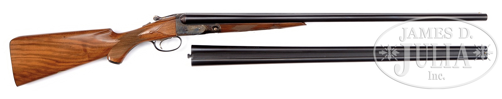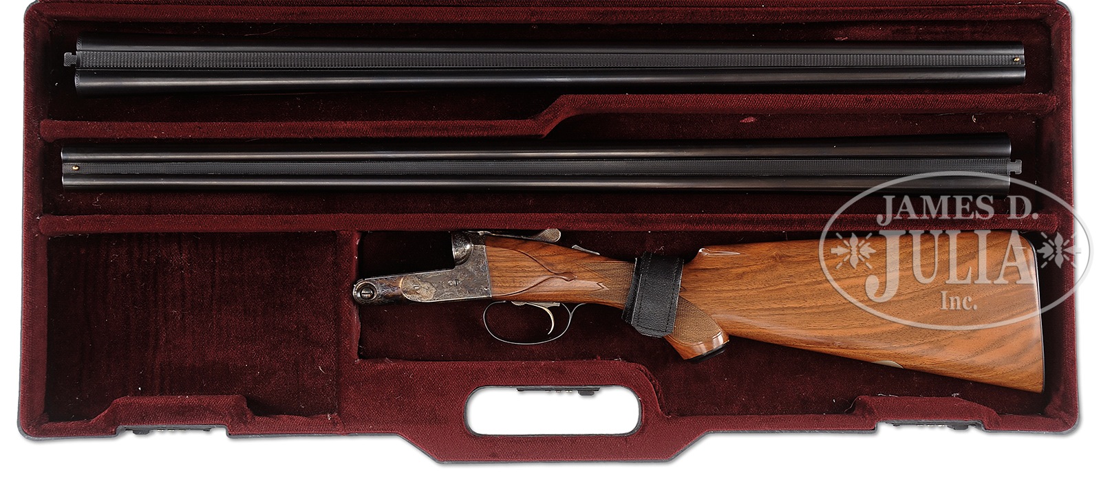 SN P-00523. Cal. 20 ga. 28″ bbl. 2-3/4 & 3″ chambers. Choked M/F. 2nd bbl: 16 ga., 28″ bbl, 2-3/4″ chamber. Choked M/F, SN 0020, with no maker’s name present. Ejectors. Beautiful case colored frame with standard DHE engraving. Sgl selective trigger. Auto-safety. Capped pistol-grip stock. 14-1/2″ LOP over skeleton BP. Splinter forend. In after-market poly case. CONDITION: Gun appears new and unfired and is in excellent overall condition. 50989-6 FTL (4,500-6,500) – Lot 1079