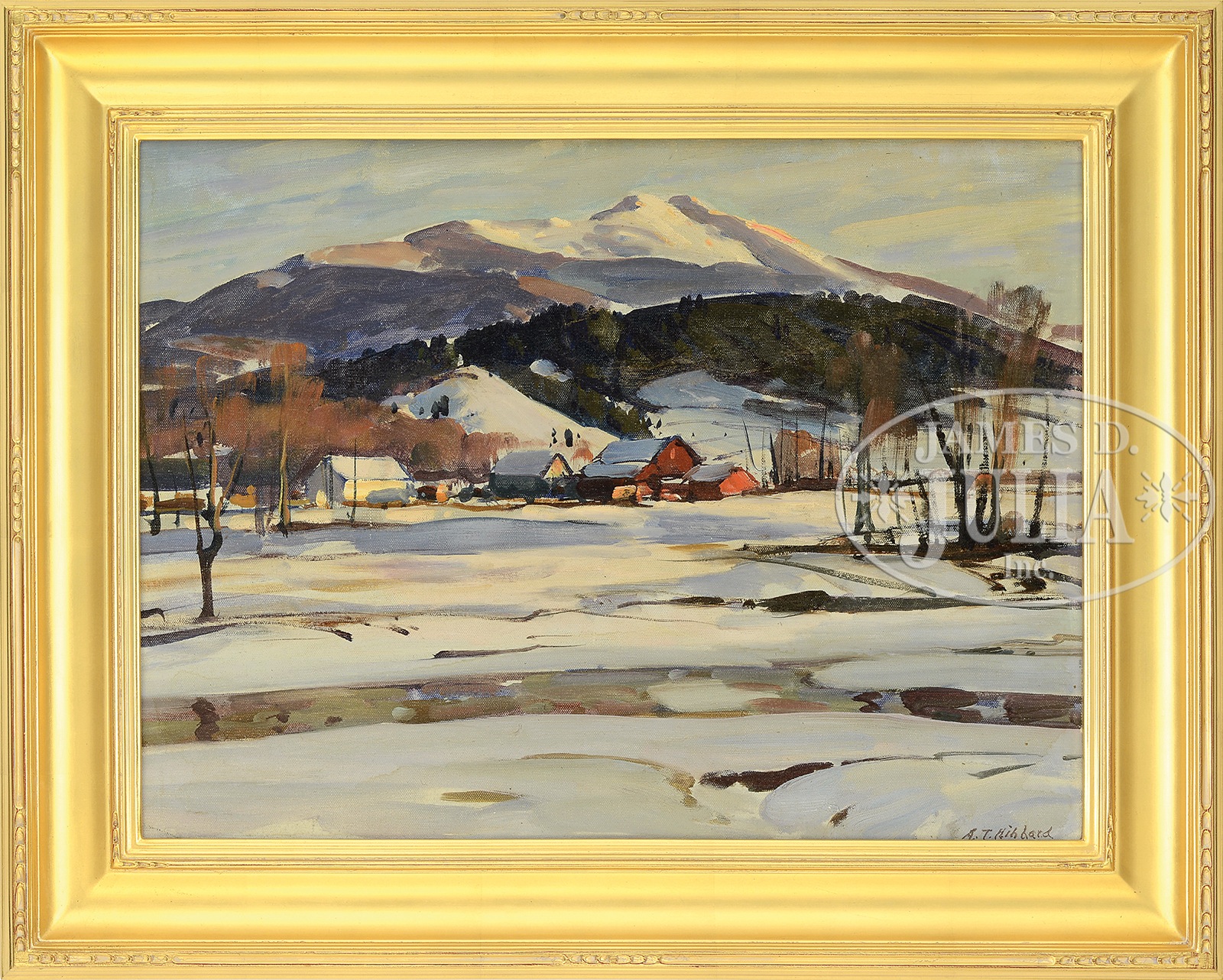 ALDRO THOMPSON HIBBARD (American, 1886-1972) “MOUNT MANSFIELD, JEFFERSON VERMONT”.Oil on board Housed in modern gilt wood frame Signed lower right “A.T. Hibbard” SIZE: 17-3/4″ X 23-3/4″. Overall: 24-1/2″ x 30-1/2″ CONDITION: Yellowed varnish, some scattered inpainting in mountain and sky, otherwise very good 1065-2 (5,000-7,000) – Lot 1080