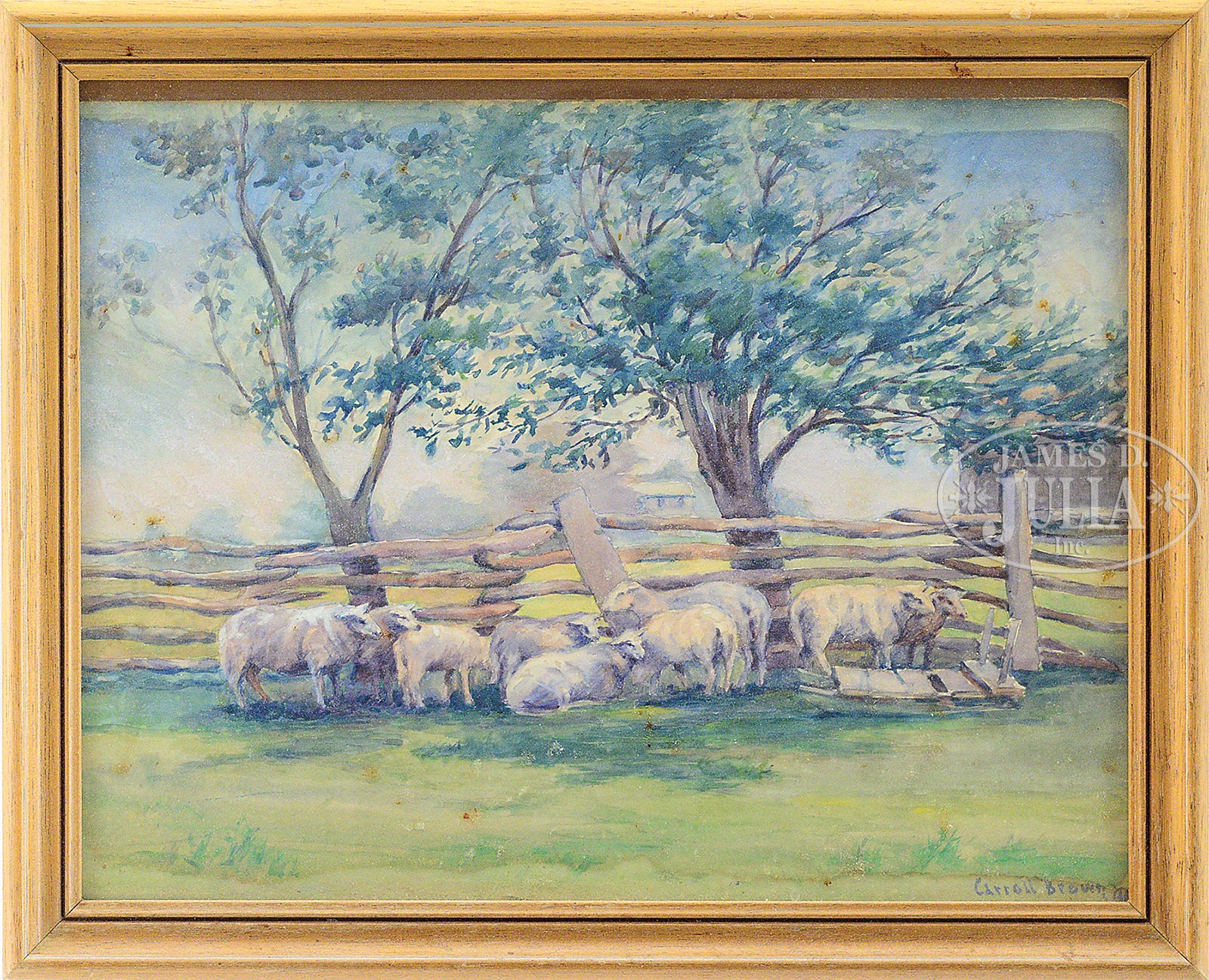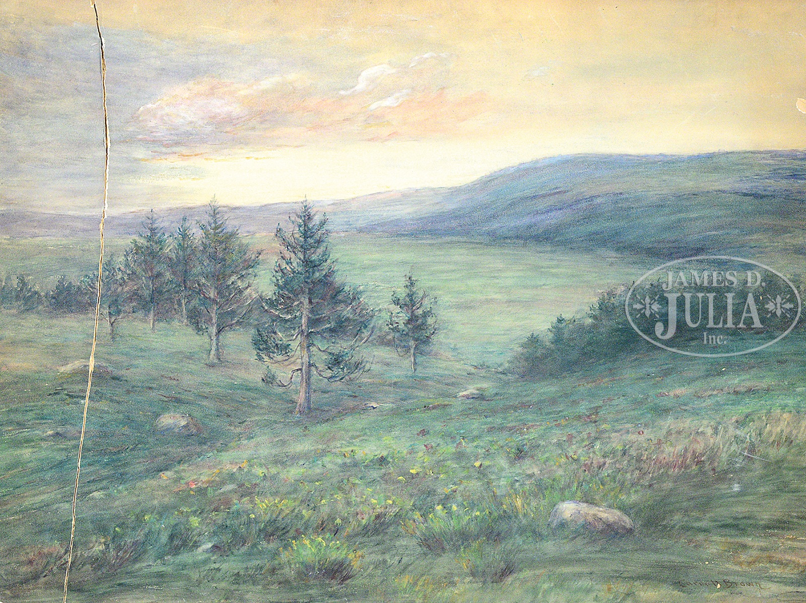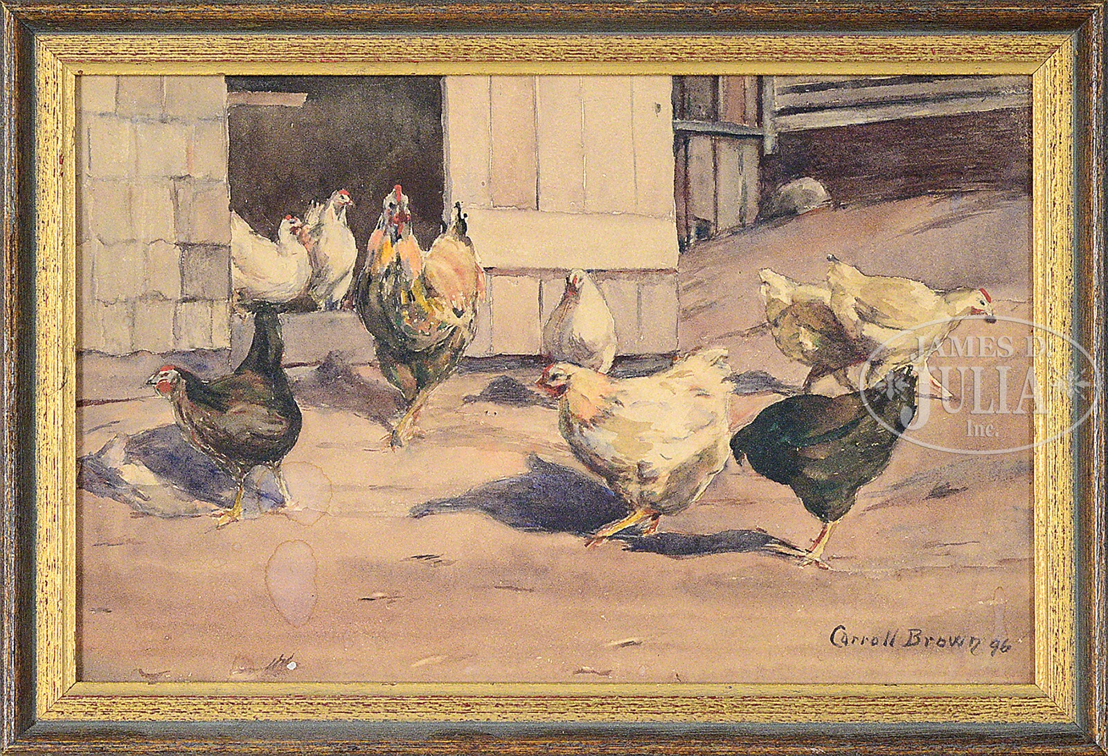 Including 1) “Wind Storm”, oil on canvas, signed lower left “Carroll Brown”, inscribed with title on stretcher and signed on verso canvas. 2) “Budding Trees, Cragsmore”, oil on board, signed and dated lower right “Carroll Brown ’08”, titled on verso. 3) Landscape, watercolor and gouache on board, signed lower right “Carroll Brown”. 4) Seascape, watercolor on board, signed and dated lower right “Carroll Brown ’08”. 5) Sheep by a Fence, watercolor, signed lower right “Carroll Brown”. 6) Chickens, watercolor on board, signed and dated lower right “Carroll Brown ’06” 1) Exhibited: John Levy Galleries, New York. “Memorial Exhibition of Paintings by Carroll Brown”, February 25-March 8, 1924, no. 13. This lot is accompanied by a photocopy of the pamphlet from the exhibition. SIZE: 1) 22″ x 30″. 2) 10-7/8″ x 14-7/8″ 3)21-1/2″ x 30″ 4)21-1/2″ x 30″ 5)19-1/2″ x 13-1/2″ 6) 6-1/2″ x 9-1/2″ PROVENANCE: Kathryn M. Brown (sister-in-law of the artist); By descent through the family CONDITION: 1) Surface grime, small losses in foreground, edges chipped. 2) Chips to edges. 3) Board is chipped on all edges, large section detached. 4) Board is chipped on all edges, large section detached. 5) Waterstaining along bottom edge. 6) Faded, waterstains 49720-5 (1,500-2,500) – Lot 1080