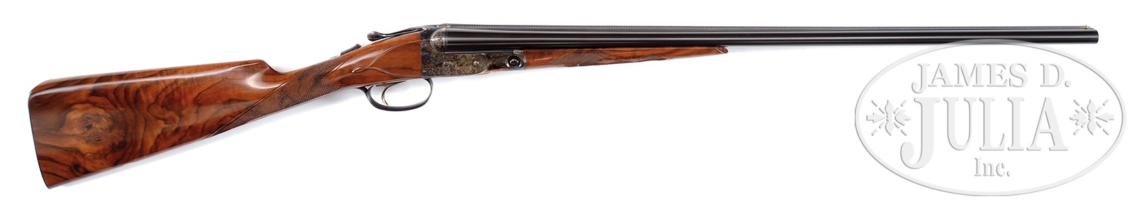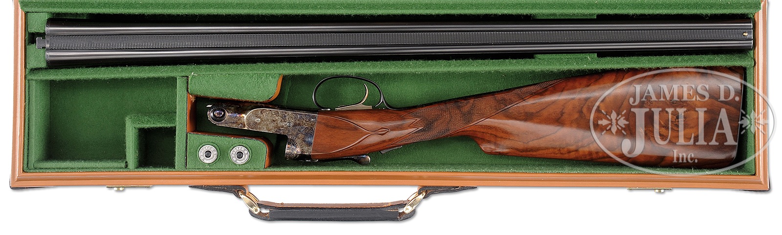 SN 28-744. Cal. 28. Chambers 2-3/4″, 26″ bbls with matted solid rib, slg brass bead. Chokes IC/MOD. Splinter forend, DHE style engraved ejector action with lightening cuts. Sgl selective trigger. Straight grip over skeleton buttplate. 14-1/4″ LOP to skeleton buttplate. DAC 1-1/4″, DAH 2-1/8″. Automatic safety. This 28 gauge is accompanied by an orig Parker Reproduction by Winchester luggage case along with the cloth dust cover. Included are two Parker Reproduction 28 ga snap caps, case tags and keys. This gun is accompanied with its orig Parker Reproduction cardboard shipping box with matching end label. CONDITION: Fine as new. This little 28 ga is delightful, shows slight signs of being assembled, but virtually zero wear. Bbls retain all of their orig finish with perfect bores. All standard Parker reproduction markings on bbls and water table. Lovely receiver engraved in DHE fashion with dog vignettes on sides and birds on floorplate. The balance covered with handsome scroll work, including long tang straight trigger guard which retains all of its orig finish. Receiver retains virtually all of its orig color with no signs of wear. Beautiful highly figured walnut with wonderful grain, both stock and forend. Forend is “as new” with all wood finish and all color case hardening on all forend metal parts. Buttstock retains all of its orig factory finish on monogrammed oval and underside of buttstock. Skeleton buttplate retains all of its factory finish. All screws are untouched. This gun assembles and functions tight and like new. The case and dust cover appear as new and show no use inside and out. The orig shipping box is in as new condition. A wonderful opportunity to get a desirable 28 gauge. 50179-21 TJW (4,000-6,000) – Lot 1080