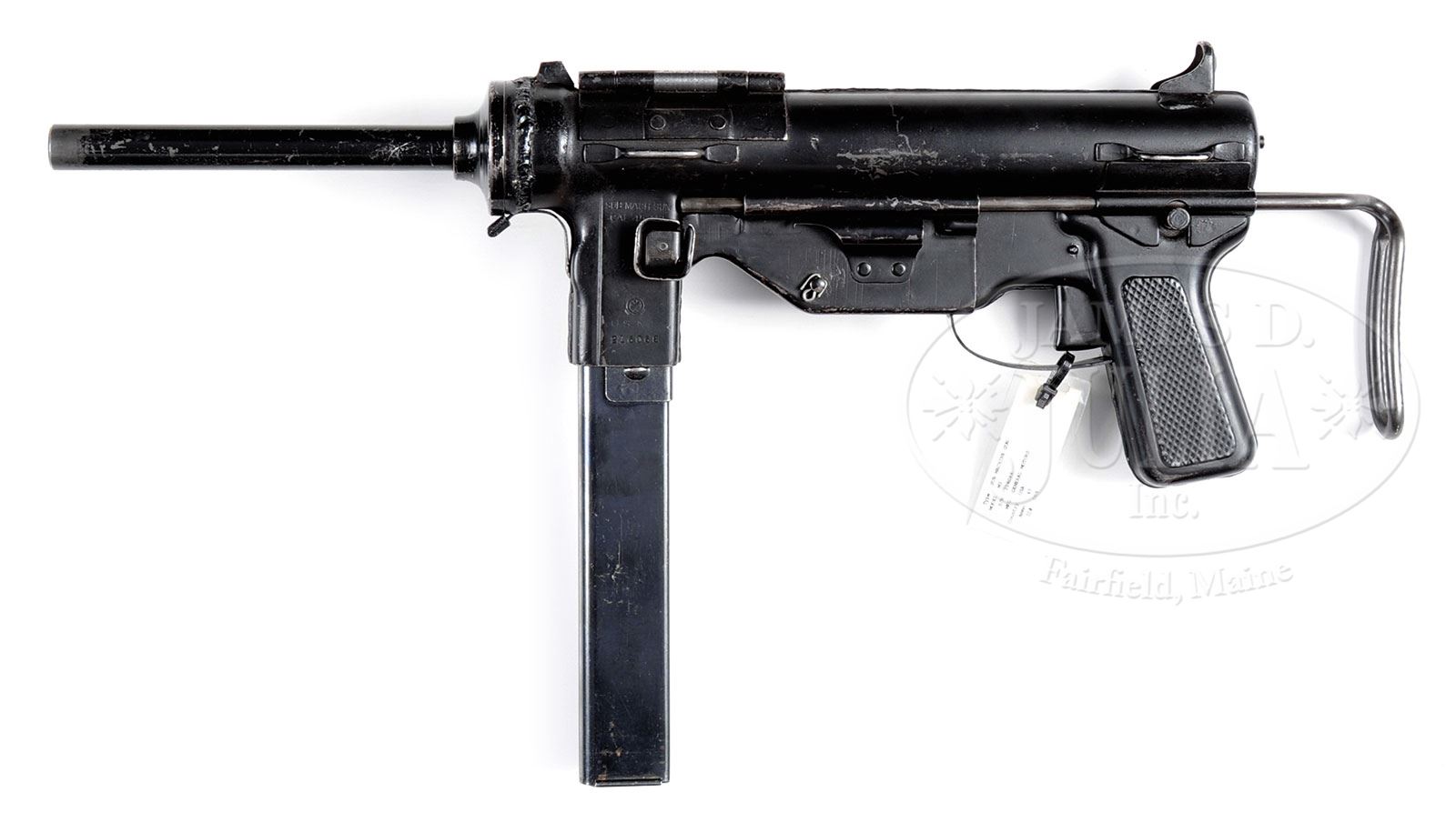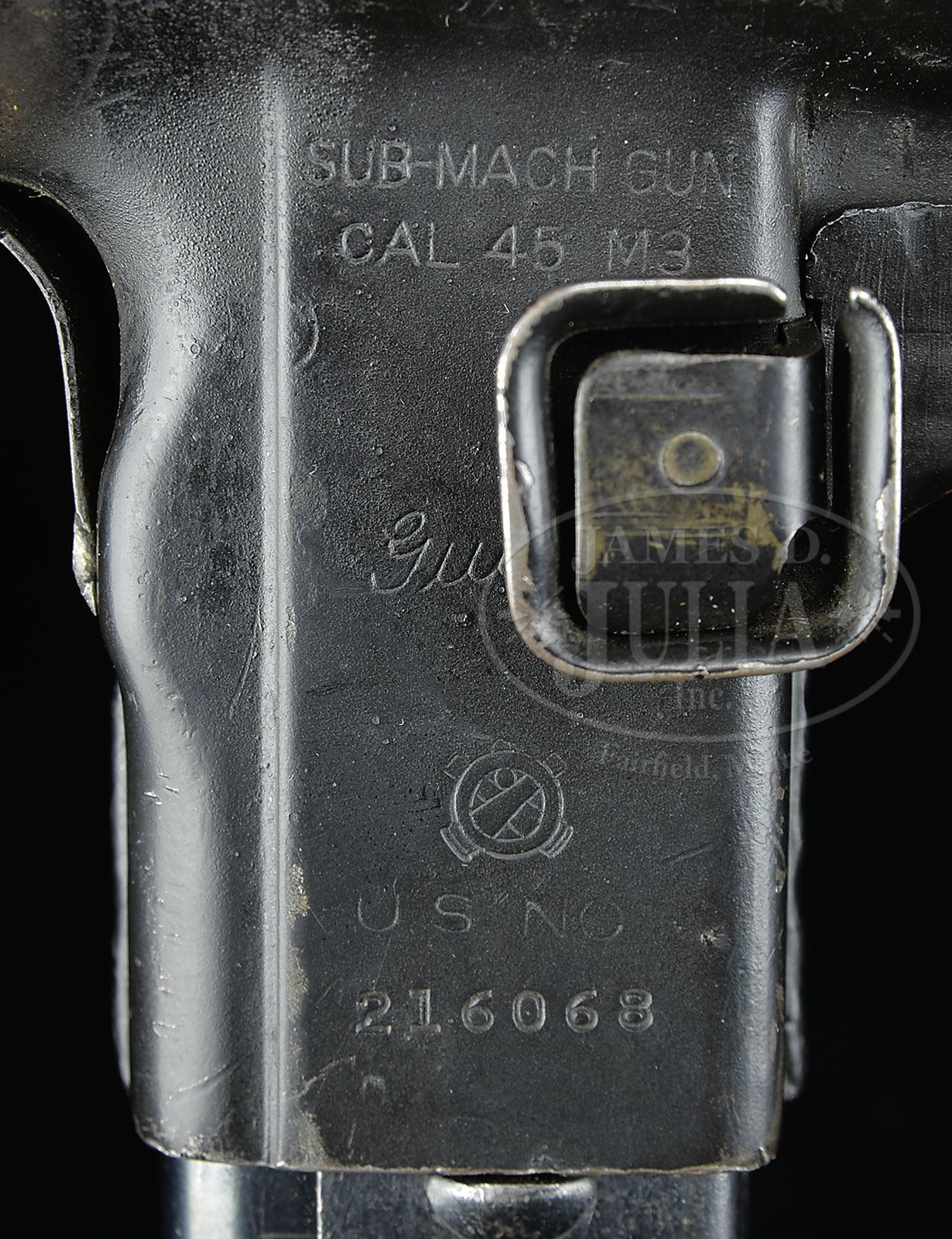 SN 216068. 45 cal. 8″ bbl. This is a nice early example of the M3 with cocking lever on the right side of receiver. Marked of left side of magazine housing “SUB-MACH GUN/CAL 45 M3”. Also marked “Guide” with the remainder obscured by the magazine latch. Also marked on left side of magazine housing with crossed artillery bbl proof mark and “US NO”. Telescoping shoulder stock deploys properly. Bbl retention clip functions properly as does ejection port cover. Comes with three 30 round magazines. Firing mechanism functions smoothly when operated by hand. This weapon appears fully functional. PROVENANCE: The class III weapons formerly on loan to Evergreen Aviation & Space Museum. CONDITION: Overall appearance and finish is about 85% black enamel paint coverage with the area around the muzzle worn to bare metal with numerous scratches to the finish on the bbl and receiver. Welding appears rather crude in some places but that’s the way these guns were made. Interior of receiver very clean. Bore is shiny, bright and clean. Bolt face likewise extremely fine. Overall a really fine example of a much sought after American submachine gun. 4-51752 JWK69 (15,000-20,000) – Lot 1081