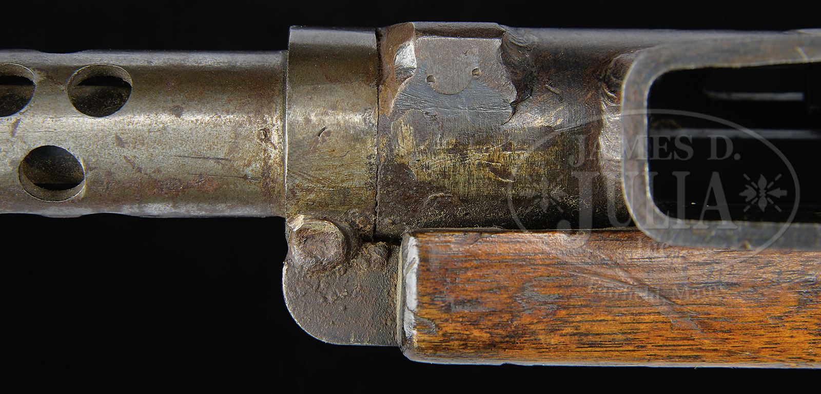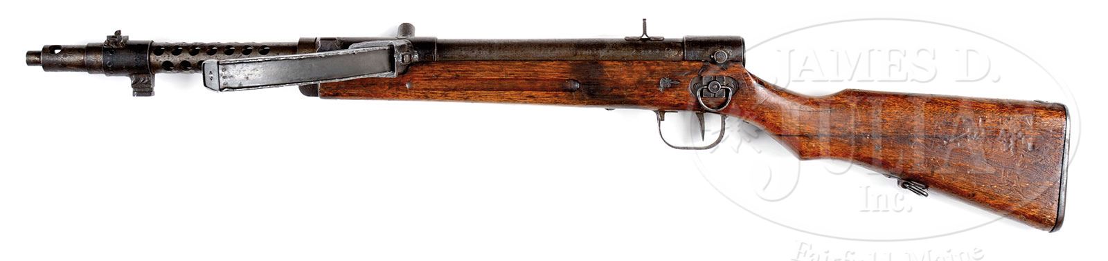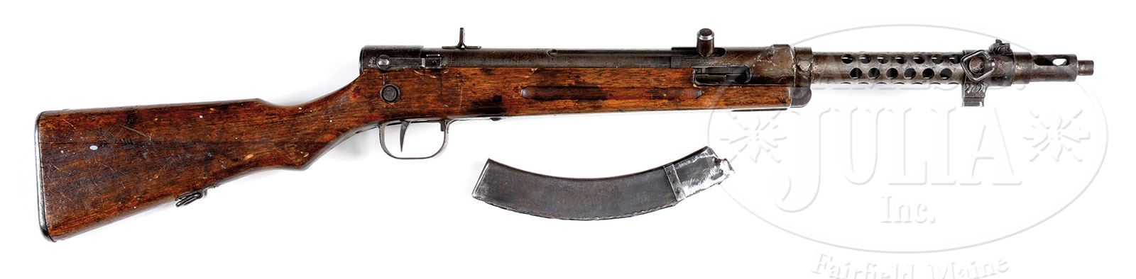 **JAPANESE NAGOYA MANUFACTURED TYPE 100 SUB MACHINE GUN DEWAT (C&R).SN 2227. 8 MM Nambu. 11-1/2″ bbl. Visible numbered parts appear matching with exception of 30-rnd magazine which is 653 with a 5 prefix. This type 100 has steel buttplate and simple 1-pc peep sight. Welding of magazine housing to receiver rather crude but completely functional. Bbl has been plugged at chamber by adding a lot of weld and welding the chamber to the receiver tube. Exterior of bbl shroud also welded on both sides just forward of chamber. It is clear that someone wanted to make sure this gun was not serviceable, however bolt does function smoothly when operated by hand. PROVENANCE: The class III weapons formerly on loan to Evergreen Aviation & Space Museum. CONDITION: Overall finish and appearance is fair with about 15% finish remaining with heavy pitting on top of receiver tube and bbl shroud with mostly a brown patina of old corrosion. Stock has numerous handling marks and dings as well as some scratches but is still serviceable. Magazine has been filed on both sides near the top and rear, fitted to this magazine housing which it fits into snugly. Unable to determine condition of bore due to welding. Bolt face is very good. Fairly heavily deactivated in the chamber area but this gun would made a fine display piece in a WWII collection. 4-51801 JWK86 (12,000-16,000) – Lot 1082