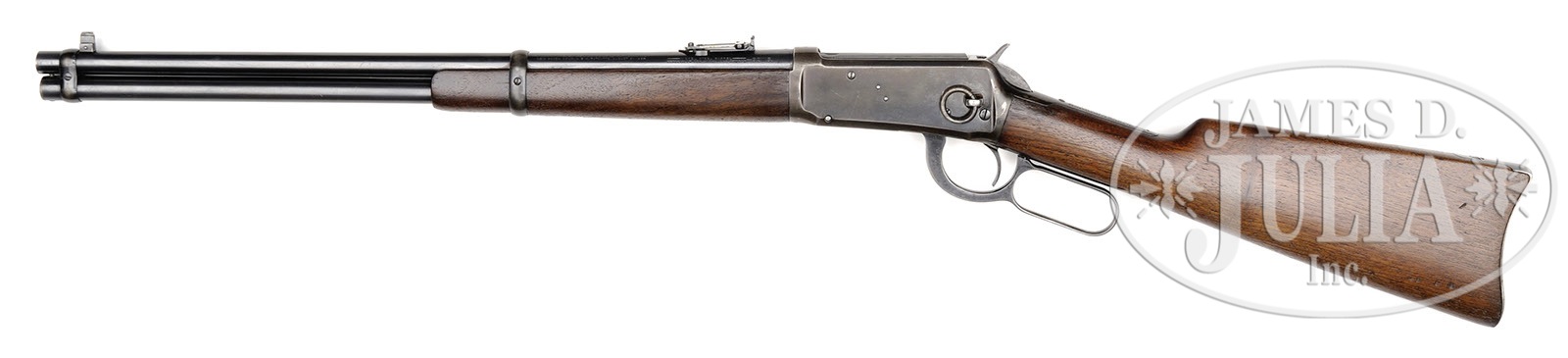 *PRE-WWII WINCHESTER MODEL 94 SADDLE RING CARBINE.SN 947568. Cal. 32 WS. Standard grade carbine with 20″ bbl, full magazine, ivory bead front sight & 2000 yard carbine ladder rear sight. Left side of receiver has a stud & ring. Mounted with uncheckered, straight grain American walnut with straight stock & carbine buttplate. PROVENANCE: Tommy Rholes Estate Collection. CONDITION: Fine. Bbl & magazine tube retain about 98-99% strong orig blue; receiver retains 93-95% dull orig finish from flaked blue; lever & hammer retain about 60% orig blue; wood has a few nicks & scratches, is sound and retains most of its orig finish. Mechanics are fine; bright shiny bore with a little roughness in the grooves. 4-50594 JR317 (1,000-2,000) – Lot 1083