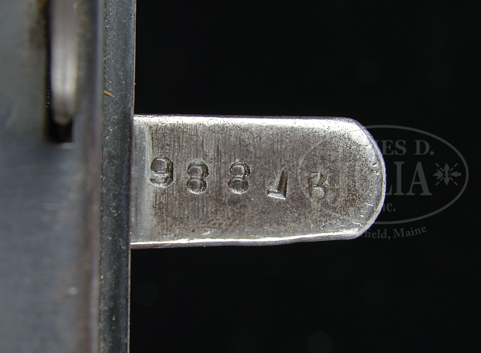 **RUSSIAN PPS-43 SUB MACHINE GUN (C&R).SN 619. 7.65 X 25 MM. 10″ bbl. This PPS-43 was made in 1945 as indicated on top of receiver. SN 619 has a 2 Cyrillic prefix on top of receiver. Proof marks are visible at underside of trunnion. Bolt SN also has 2 Russian Cyrillic letter prefix and its number does not match receiver. There is a small weld tab on lower receiver where the bolt rests in its forward position which indicates that this weapon may be a reactivated DEWAT. Although this weapon has Russian Cyrillic letters it is registered on the ATF form 4 as coming from China as model 1945. This weapon includes two 30-rnd smooth sided magazines. Workmanship on this weapon is somewhat crude but better than this cataloger has seen on other examples. Mechanism functions smoothly when operated by hand. This gun appears fully functional. PROVENANCE: The class III weapons formerly on loan to Evergreen Aviation & Space Museum. CONDITION: Overall finish and appearance is fine with about 75% finish remaining with numerous spots of pitting throughout. Wear to high points revealing bare metal. There is dust and grime in recessed areas from long storage. Bore has strong rifling with light pitting. Bolt face is fine with some light pitting. Magazines retain about 85% of their orig finish with some light pitting and thinning to blueing. Hand grip is extremely fine. This is a popular and sought after sub machine gun model from WWII. 4-51777 JWK80 (12,000-16,000) – Lot 1084