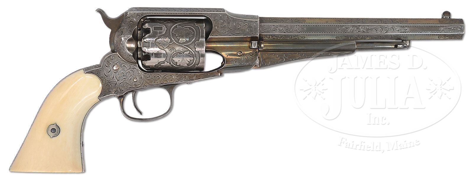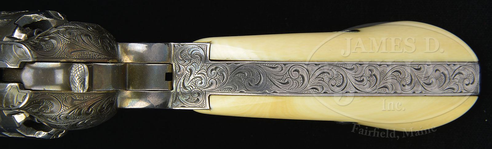 RARE ENGRAVED REMINGTON NEW MODEL ARMY PERCUSSION REVOLVER.SN 86400. Cal. 44. Beautiful silver finished New Model Army with 8″ oct bbl, pinched post front sight and 3-line address. Mounted with smooth 2-pc certifiable antique ivory grips matching numbered to this revolver. Revolver is wonderfully engraved in New York style, probably by the master himself, L.D. Nimschke, in fine, intertwined foliate arabesque patterns with fine pearled background. Engraving is deluxe coverage with feather patterns on top strap and a fine geometric pattern on top front of frame. Matching foliate arabesque patterns extend over all of the exposed bbl flats with etched grape leaf & vine patterns on the rammer handle web. Matching foliate arabesque patterns cover the entire back strap & butt strap with more matching patterns on the trigger bow and bottom front of frame. Cylinder has fabulous deep-etched grape leaf & vine patterns completely around the circumference. The New Model Army revolver was produced in large numbers 1863-1875 and was one of the most popular sidearms during the Civil War. There were also very popular with the buying public and saw extensive hard service on the American frontier. Undoubtedly this revolver would have belonged to someone of great wealth or importance. This revolver, along with a New Model Navy revolver being sold elsewhere in this auction, is identically engraved and likely belonged to the same individual. Special Note: This item contains or is made of ivory. Do not bid on this lot unless you have read and agreed to our “Ivory Position Statement” and the “Waiver of Legal and Financial Risk to James D. Julia in regards to your Purchase of an Ivory Object”. This information is located in our catalog on pages 30 and 31. PROVENANCE: The Elliott Burka Estate Collection. CONDITION: Very fine to extremely fine. Overall retains 99%+ of a fine restored finish, probably from the factory. Whoever restored it exercised great care and barely touched the engraving leaving most of the fine shading completely intact. Grips are as new with a fine mellow ivory patina and are absolutely orig to this revolver. Hammer is not solid in the half cock notch, otherwise mechanics are fine; strong dark bore with scattered pitting. 4-56309 JR128 (20,000-35,000) – Lot 1084
