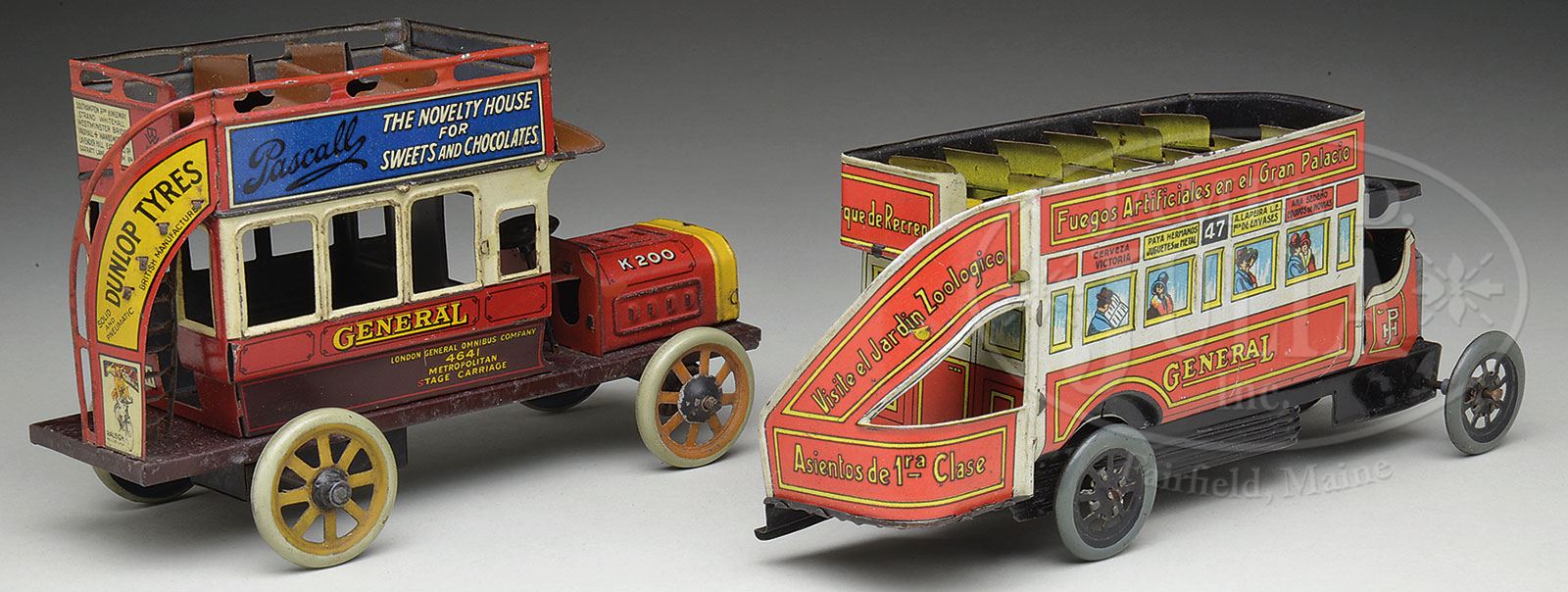 BING ENGLISH STYLE DOUBLE DECKER BUS AND PAYA DOUBLE DECKER BUS.The Bing bus is a great little tin windup bus from the 1920’s. This toy depicts the typical English double-decker bus seen on the streets of London. An abundance of advertising encompassing the upper level as well as the circular staircase. Bing trademark is on upper level of rear of bus. Clockwork mechanism is intact and in working order. Bing manufactured several buses of this nature and this was perhaps the least elaborate, but still quite an appealing toy. The Paya version marked with a “PH” on the drivers door is also from the 1920’s and this depicts the English style bus with elaborate lithography including passengers in the various windows. The advertising is in Spanish and obviously this toy was made for the Spanish market, but exported as well. Windup mechanism is in function condition. SIZE: 7-1/4″ and 8-1/2″ respectively. PROVENANCE: The Estate of Carol and Jerry Soling. CONDITION: The Bing bus is in good to very good condition, lightly heavier wear/paint loss to white section of upper level. The Paya version overall is in very good to fine condition with a bright litho finish. 1-14693 (800-1,200) – Lot 1085 Auction: Advertising, Toy & Doll Auction - Fall 2014 Please Note: All prices include the hammer price plus the buyer’s premium, which is paid by the buyer as part of the purchase price. The prices noted here after the auction are considered unofficial and do not become official until after the 46th day. |