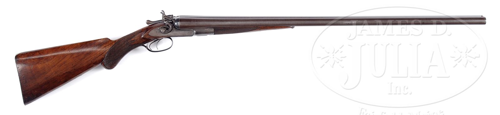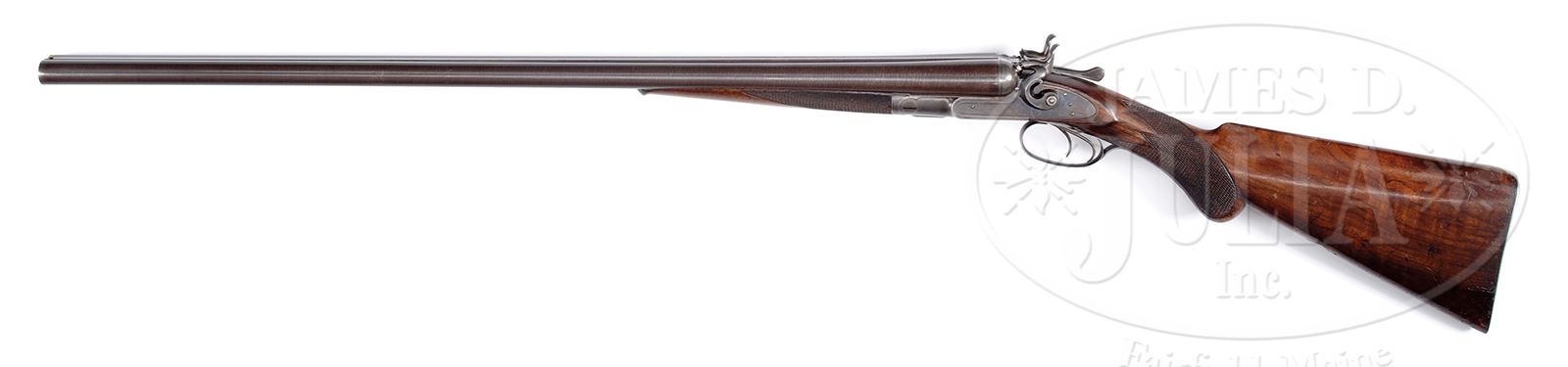 COLT MODEL 1878 HAMMER GUN.SN 10774. 12 Ga. 30″ laminated steel bbls. 2-3/4″ chambers. Choked: IMP CYL/MOD. Full length twist steel rib with brass front bead, marked “COLT’S PT. F. A. MFG. CO. HARTFORD CT USA”. Double triggers, extractors, no safety. Full pistol grip buttstock with 13-7/8″ LOP over full steel buttplate with nickel oval on bottom. Splinter forend with Deeley latch and ebony tip, checkered in 2-point pattern. Buttstock with 3-point checkering. Receiver nicely line engraved, marked “COLT’S PT. F. A. MFG. CO.” on both lockplates. Straight top lever. Weight: 7 lb 9 oz. PROVENANCE: The Estate of B.E. “Andy” Anderson. CONDITION: Very good. Bbls retain 75% laminated pattern, which has darkened brown, with handling marks and a couple of repaired dents. Receiver retains 25-30% orig case color, mostly on left lock, the remainder having toned. Trigger plate and trigger guard bow retain approx 40% orig blued finish. Forearm metal has turned gray. Top lever retains approx 45% orig high polished blue. Buttstock and forearm retain approx 75-80% orig finish with light scratches and dents, particularly towards toe of stock and buttplate. Mechanics are excellent. Bores are fair with scattered pitting throughout. 49531-40 JSL138 (750-1,250) – Lot 1085