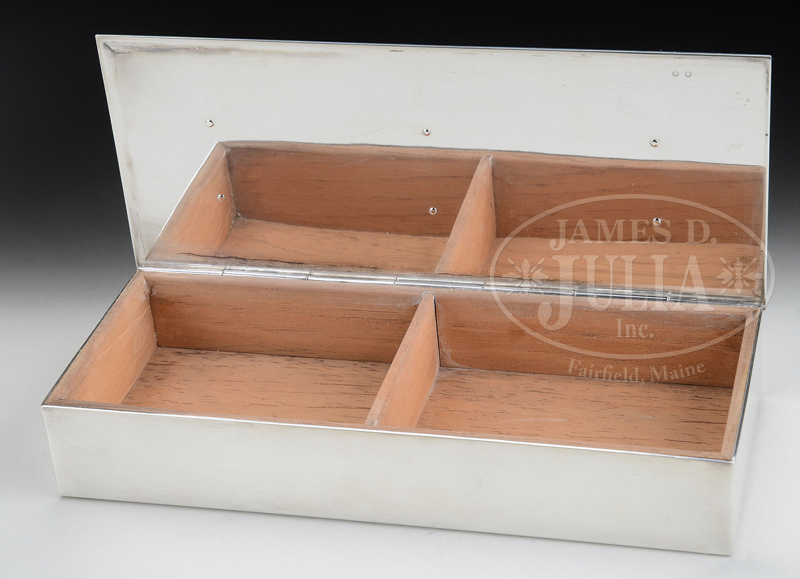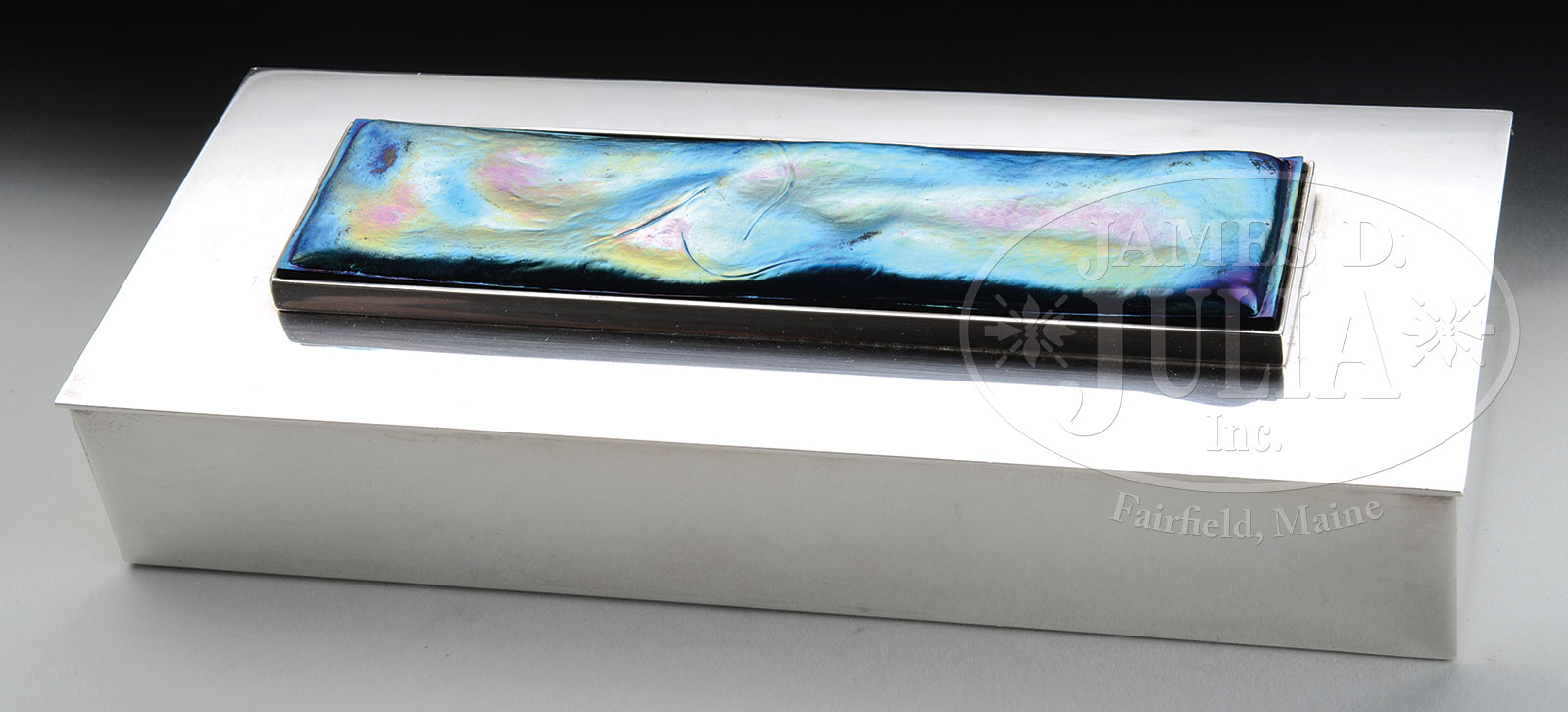 TIFFANY & CO. STERLING TURTLEBACK BOX.Tiffany & Co. rectangular sterling silver dresser box with simplistic decor and wooden interior liner has a rectangular iridescent turtleback tile mounted on the hinged lid. Signed on the underside “Tiffany & Co. Makers Sterling Silver 925″. SIZE: Box 1-1/2″ t x 9″ w. Turtleback tile 6-3/4″ x 1-3/4”. PROVENANCE: From an Unreserved Texas Estate. CONDITION: Very good to excellent with minor wear to high surfaces of tile. 51362-82 (1,500-2,500) – Lot 1085