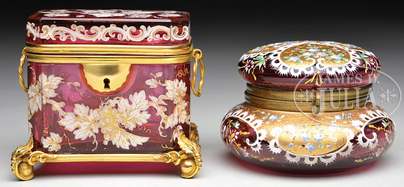 TWO MOSER DECORATED DRESSER BOXES.1) Moser cranberry glass dresser box has rectangular body with beveled corners and is decorated with white enameled grape leaves and clusters with gilded highlights. Box is further decorated with a white and gilded scroll border around the lid. It is finished with a brass hinge, handles, collar, lock, and base. 2) Moser round cranberry glass dresser box is decorated with gilded background and enameled blue and white flowers with a lacy white enameled outline. Box is finished with a brass hinge, collar, and latch. SIZE: 1) 3-1/4″ w x 2-1/8″ d x 3-1/4″ t. 2) 3-1/2″ dia x 2-1/2″ t. PROVENANCE: George Klabin Collection. CONDITION: Each is very good to excellent with some minor wear to gilding. 5-67434 (500-700) – Lot 1086