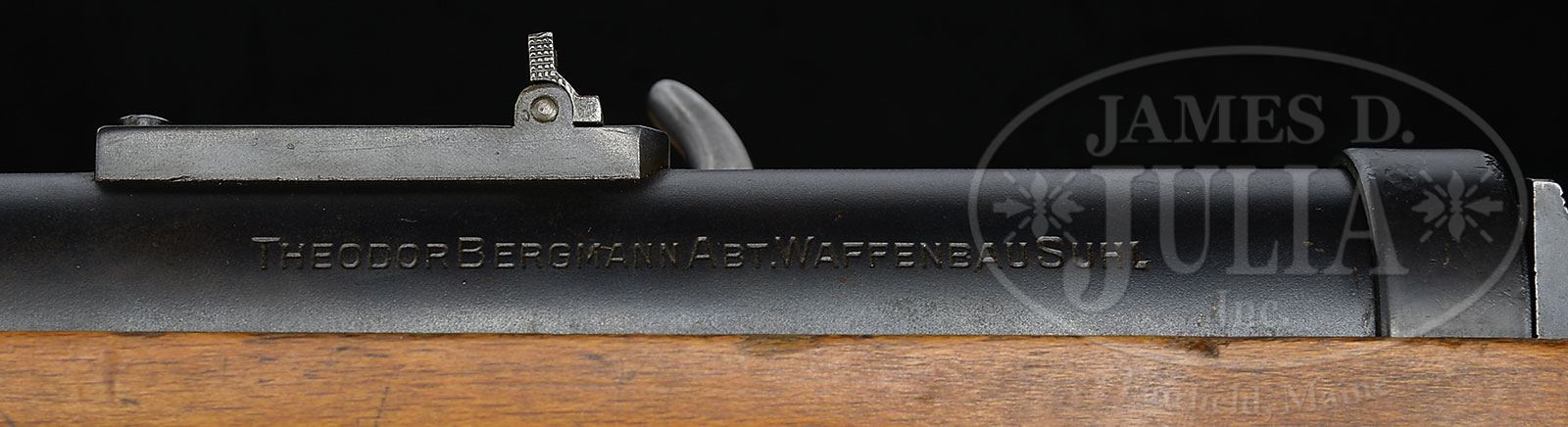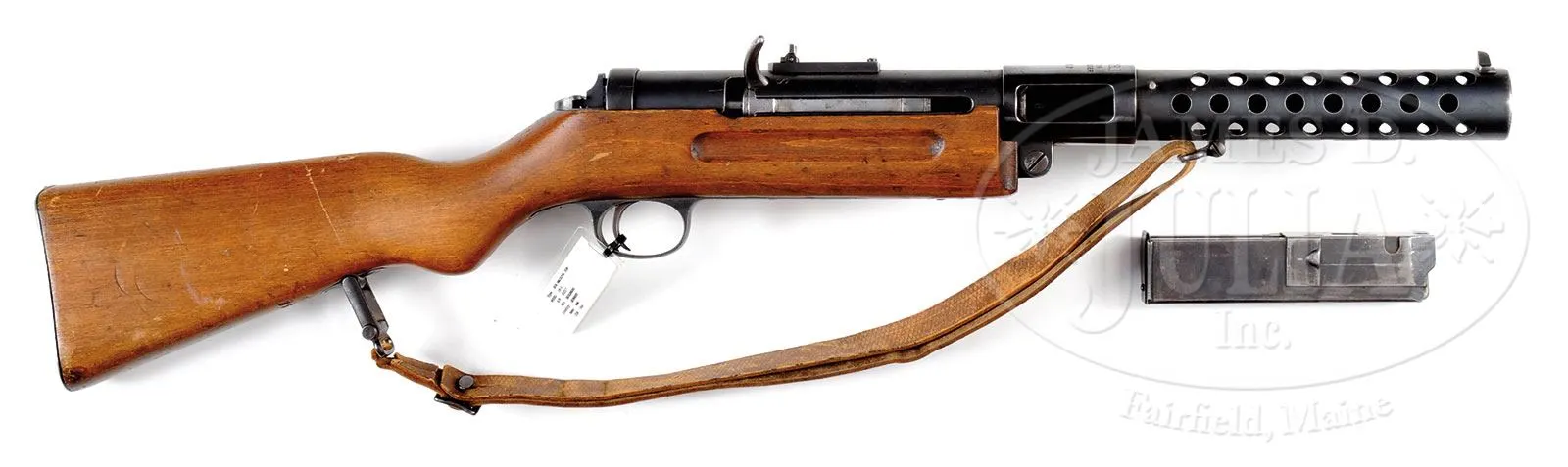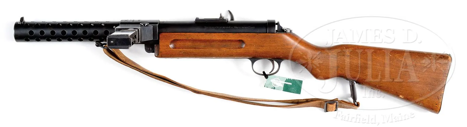 **BERGMANN MP-18.1 SUB MACHINE GUN (C&R).SN 35217. 9 MM. 8″ bbl. This is an exceedingly fine specimen of the MP-18.1 which includes orig leather sling and one orig 20-rnd magazine marked “C.G. Haenel”. Marked on top of receiver “M.P.18.I/SYSTEM/SCHMEISSER” followed by SN. All matching numbers except for rear sight tension spring and detent latch numbers. Sling has parted at the rear sling swivel but this could be repaired. Mechanism functions smoothly when operated by hand. This gun appears fully functional. PROVENANCE: The class III weapons formerly on loan to Evergreen Aviation & Space Museum. CONDITION: Overall finish and appearance is extremely fine as refinished. Retains 90% of a dull refinish over scattered pitting on tube and bbl shroud. Magazine housing retains more of a high luster finish with some slight areas of light pitting. There are areas overall where the finish is thinning to a gray patina. Buttplate is a light gray metal finish. Crown proof marks visible on top of receiver and on buttplate. Stock has numerous handling marks and a couple small chips on either side of stock with one significant 3/8″ chip at very rear of receiver. Bore is shiny and bright with strong rifling with some slight frosting. 4-51774 JWK78 (12,000-15,000) – Lot 1086