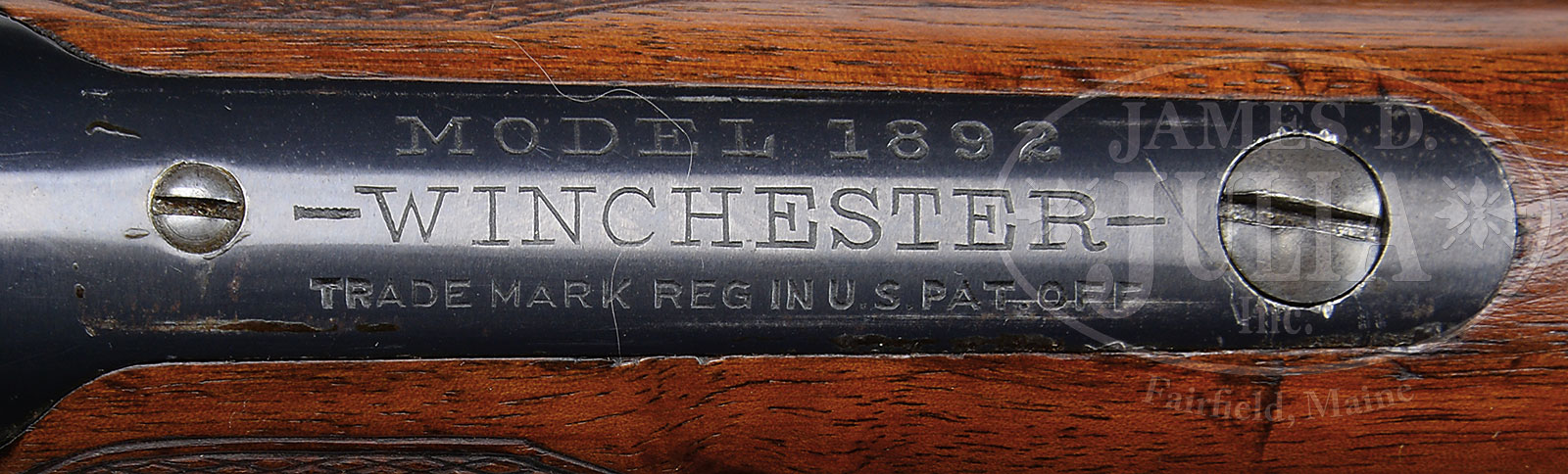 *SCARCE WINCHESTER MODEL 1892 SEMI-DELUXE LEVER ACTION RIFLE.SN 637355. Cal. 25-20 WCF. Fine semi-deluxe rifle with 24-1/4″ oct bbl, full magazine, half nickel front sight with screw and semi-buckhorn rear sight. Left top flat of bbl is marked “MANUFACTURED BY THE WINCHESTER REPEATING ARMS CO. / NEW HAVEN. CONN. U.S.A. PATENTED OCTOBER 14. 1884.”, with cal. marking “25-20 W.C.F.” near the receiver and Winchester proof mark on top flat & front ring of receiver. Mounted with straight grain American walnut with I-style checkered forearm & capped pistol grip stock that has Winchester embossed hard rubber grip cap & buttplate. Left side of lower tang, under the wood, is marked with assembly number “800” and “X”. Top tang channel of buttstock is marked with assembly number “1979”, which indicates at some time in the past the wood has been changed. PROVENANCE: Wes Adams Estate Collection. CONDITION: Very fine. Bbl and mag tube retain 93-95% orig blue showing sharp edge wear and a couple of rub marks. Receiver retains 95% orig blue showing sharp edge wear, thinning on bottom and blending with brown patina, normal handling marks with some fine scratches and a couple of small dings over the top. Hammer retains dark orig case colors. Lever retains orig case colors blending with gray patina. Wood is sound with a gouge in the left wrist showing moderate wear to the checkering with a few light nicks & scratches and retains most of its orig finish with some minor touch up on left side of buttstock at the buttplate. Mechanics are crisp with a nice shiny bore. 51688-2 JRL (5,000-7,000) C&R – Lot 1086