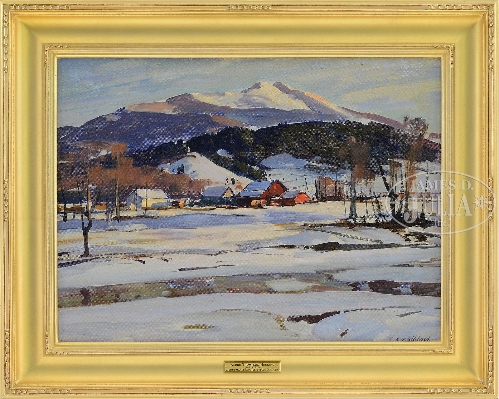 ALDRO THOMPSON HIBBARD (American, 1886-1972) “MOUNT MANSFIELD, JEFFERSON VERMONT”.Oil on canvas board Housed in a modern giltwood frame with presentation plaque bearing title Signed lower right “A.T. Hibbard” SIZE: 17-3/4″ x 23-3/4″. Overall 24-1/2″ x 30-1/2″ CONDITION: Very good with minor discolored varnish and minor restoration to sky 51120-7 (6,000-9,000) – Lot 1086