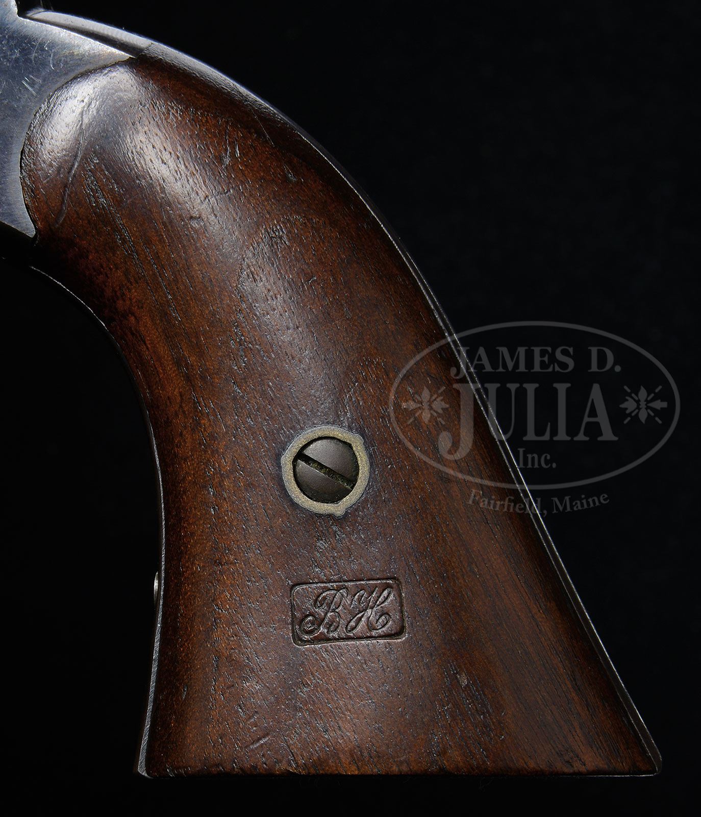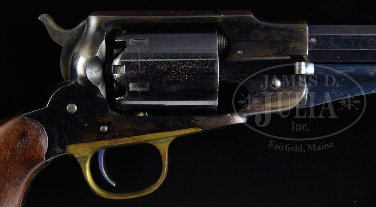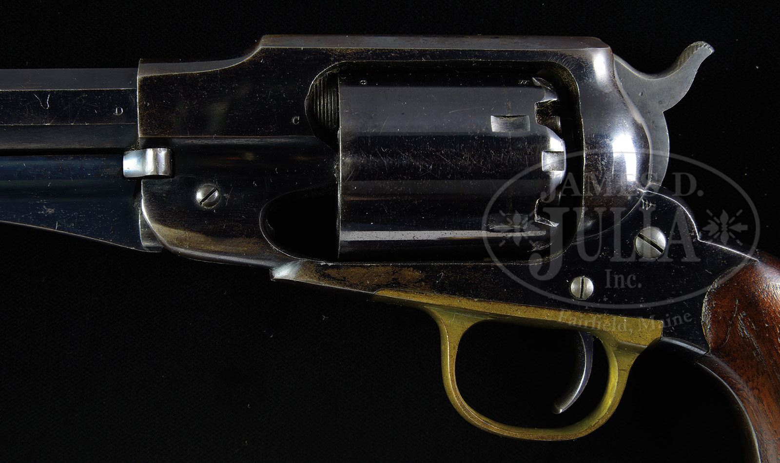 SCARCE MARTIALLY MARKED REMINGTON NEW MODEL ARMY PERCUSSION REVOLVER.SN 91213. Cal. .44. Blue finish with 8″ oct bbl, pinched post front sight & 3-line address. Trigger guard is unplated brass and is mounted with 2-pc walnut grips that has a crisp, clear cartouche on left side. Grips are matching numbered to this revolver. There are small inspector initials over various parts including frame, bbl, cyl, trigger guard and bottom edges of grips. Frame has SN “91213” & bbl has SN “91523”. This model revolver was produced in large quantities 1863-1875 and was one of the most popular sidearms throughout the Civil War and on the American frontier for its large caliber and ease of reloading, especially with mounted troops. A trooper could carry one or more charged cylinders and quickly exchange it for one that had been fired. These revolvers remained in service with the Army, and especially the Cavalry, until the military adopted the Colt Single Action Army revolver in 1873. Even after that, the Remington Army remained in service for several more years until the Colt had been completely distributed. It is well documented that Custer’s 7th Cavalry carried the Remington New Model Army until 1875/76 as did the 2nd & 10th Cavalry Regiments, all of which were engaged continuously in fighting Indians on the American frontier. Revolvers of this model are rarely found today with high orig finish. PROVENANCE: The Elliott Burka Estate Collection. CONDITION: Extremely fine. Bbl retains 95-97% strong orig blue with some light dulling & scratches. Frame retains 75-80% glossy orig blue with the majority of losses on right side, flaked not worn to a dark patina. Rammer retains about 97% orig blue. Hammer retains virtually all of its orig case colors. Cyl retains about 95-96% glossy orig blue with virtually all of its orig blue in the chambers. Grips are sound with only minor bruise on right side & overall retain virtually all of their orig oil finish. Back strap is blue-grey patina. Mechanics are crisp, brilliant shiny bore, probably unfired. 4-56310 JR117 (5,000-8,000) – Lot 1087