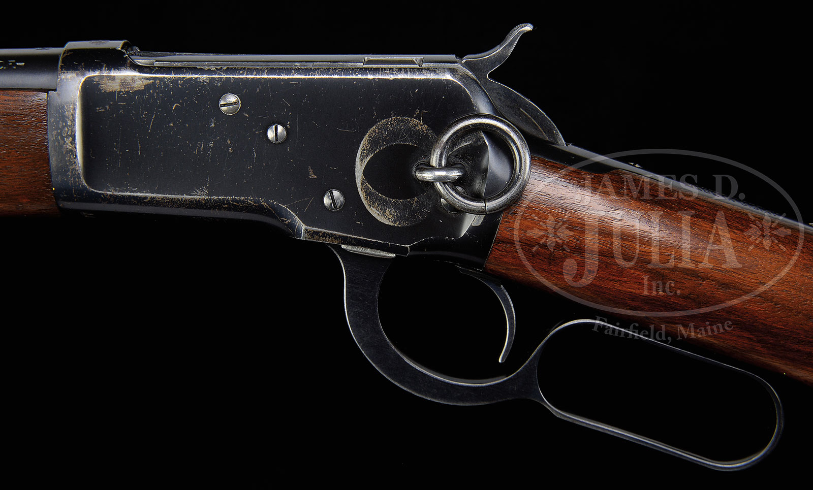 *WINCHESTER MODEL 92 SADDLE RING CARBINE.SN 993307. Cal 44 WCF (44-40). Standard carbine with 20″ bbl, full magazine, square base front sight with blued steel blade and standard 2000 yard carbine ladder rear sight. Left side of receiver has a staple & ring. Mounted with very nicely figured, uncheckered American walnut with straight stock and carbine buttplate. This late carbine has the last style bbl marking and top tang marking with blued lever, hammer and buttplate. This carbine was produced in about 1928 in an era where real cowboys still rode the range with a carbine in the saddle scabbard and the Model 92 carbines were still very popular at that time. Those carbines are rarely found today with high orig finish. CONDITION: Very fine. Bbl & magazine tube retain about 98% crisp orig factory blue. Receiver retains 88-90% bright orig blue with sharp edge & high point wear with some light scratches and a halo from the saddle ring. Lever & hammer retain most of their orig blue and the buttplate about 50% thinning blue. Forearm has a scratch on the left side at the barrel band which is commonly seen on these rifles, otherwise wood is sound and retains virtually all its original factory old finish. Forearm may have had a light coating of finish applied. Mechanics are crisp, brilliant shiny bore, shows very little use. 51762-4 JRL (5,000-8,000) C&R – Lot 1087