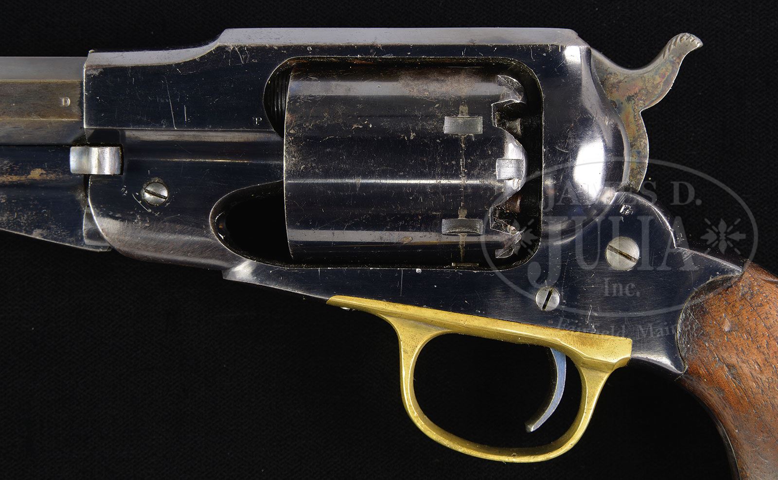 EXCEPTIONAL MARTIALLY MARKED REMINGTON NEW MODEL ARMY PERCUSSION REVOLVER.SN 123890. Cal. .44. Blue finish with 8″ oct bbl, pinched post front sight & 3-line address. Trigger guard is unplated brass and it is mounted with 2-pc walnut grips and has a crisp, clear cartouche on left side. Grips are matching numbered to this revolver. Various parts have small inspector initials including frame, bbl, rammer and cyl. This model revolver was produced in large quantities 1863-1875 and was one of the most popular sidearms throughout the Civil War and on the American frontier for its large caliber and ease of reloading, especially with mounted troops. A trooper could carry one or more charged cylinders and quickly exchange it for one that had been fired. These revolvers remained in service with the Army, and especially the Cavalry, until the military adopted the Colt Single Action Army revolver in 1873. Even after that, the Remington Army remained in service for several more years until the Colt had been completely distributed. It is well documented that Custer’s 7th Cavalry carried the Remington New Model Army until 1875/76 as did the 2nd & 10th Cavalry Regiments, all of which were engaged continuously in fighting Indians on the American frontier. Revolvers of this model are rarely found today with high orig finish. PROVENANCE: The Elliott Burka Estate Collection. CONDITION: Very fine+, all matching including grips. Bbl retains 75-80% glossy orig blue with loss areas flaked, not worn, to a medium/dark patina. Rammer retains about 80% orig blue. Frame retains about 98% glossy orig blue with only light sharp edge wear, a few small scratches & a few small freckles of surface rust on right side. Cyl retains about 90% glossy orig blue with one area of flaking & shows about all of its orig blue in the chambers. Hammer retains bright case colors. Grips are sound with a gouge on right side & light to moderate wear on edges, and retain most of their orig oil finish. Mechanics are crisp, brilliant shiny bore, appears to be unfired. 4-56514 JR116 (3,500-5,000) – Lot 1089
