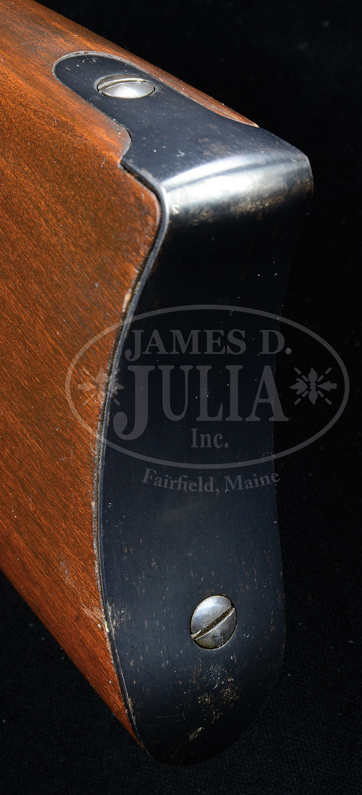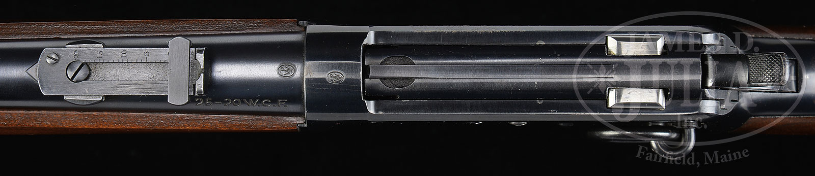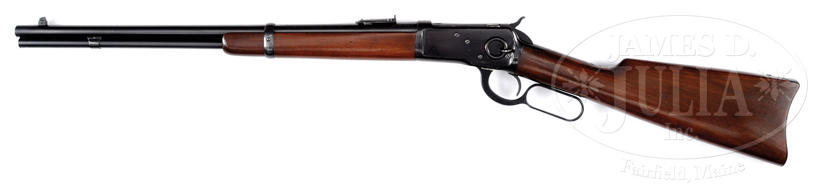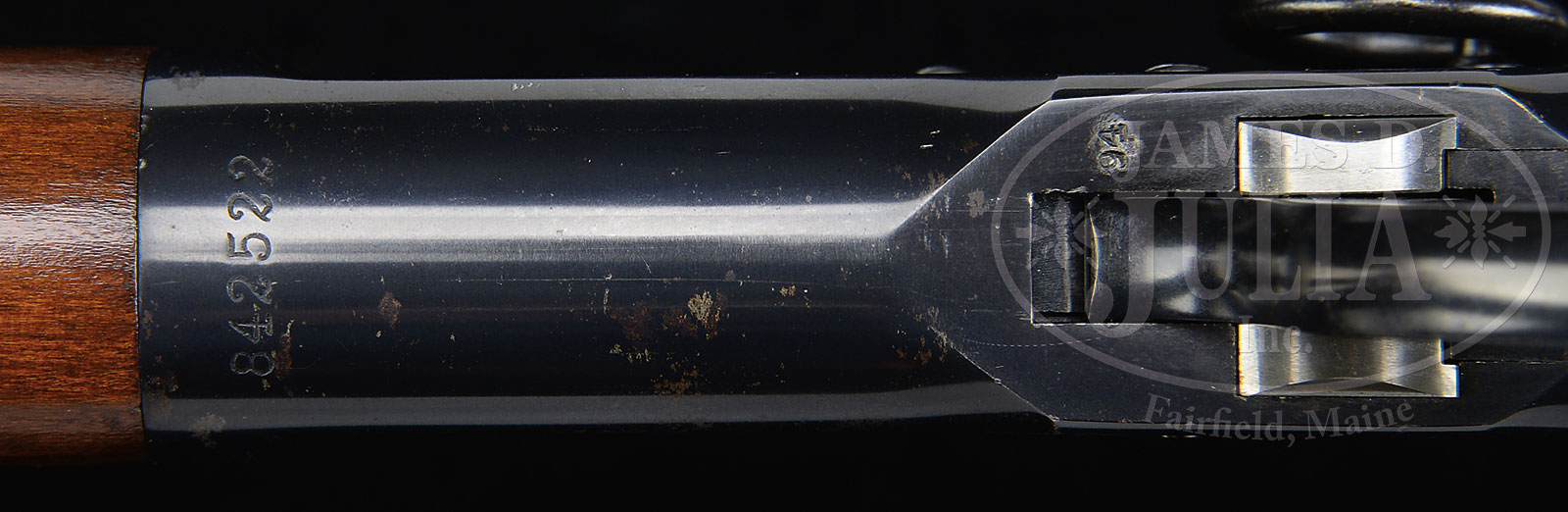 *FINE WINCHESTER MODEL 1892 SADDLE RING CARBINE.SN 842522. Cal 25-20. Standard carbine with 20″ bbl, full magazine with 1 band & forearm band, square base front sight with blued steel blade and 2000 yard carbine ladder rear sight. Bbl has standard late markings. Receiver has a staple & ring in the left side. Mounted with nicely figured gumwood with straight stock and carbine buttplate. This 1927 carbine has blued lever, hammer & buttplate. CONDITION: Extremely fine. Bbl & magazine tube retain 98-99% crisp, original factory blue with about 99% blue on the magazine band. Forearm band retains about 80-85% blue, mostly from flaking. Receiver retains about 92-93% glossy orig blue with the losses from slight sharp edge wear and a couple small spots of flaking with a few light scratches on the right side and a saddle ring halo on the left side. Lever & hammer retain virtually all of their orig blue. Buttplate retains 97-98% orig blue showing wear only on the heel. Stock has a couple small nicks & dings with a deep scratch on the right side of wrist and another on the forearm from someone removing the forearm band, otherwise wood is sound and retains virtually all of its orig factory finish. Mechanics are crisp, brilliant shiny bore. May not have ever been fired. 51762-3 JRL (3,000-5,000) C&R – Lot 1089