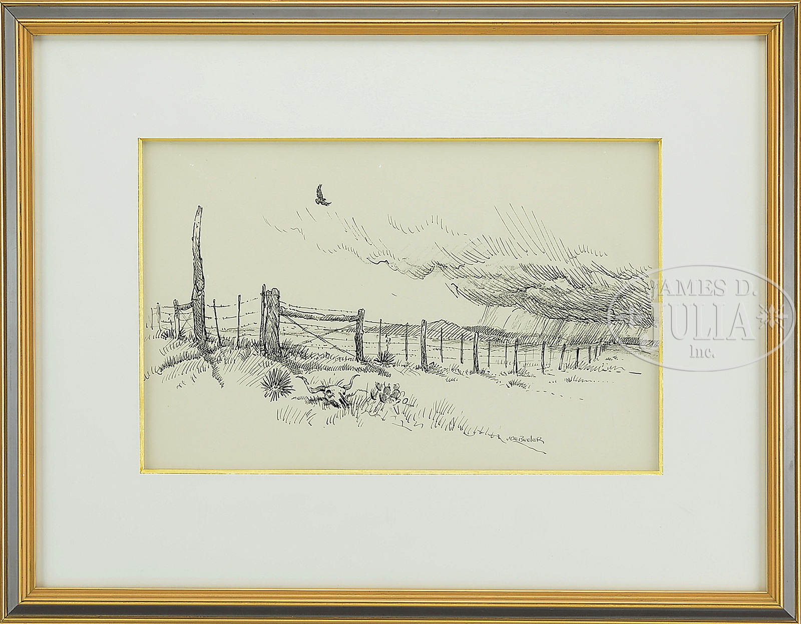 JOE BEELER (American, 1931-2006) THE FENCE THAT TAMED THE WEST.Pen & ink on paper Housed in a contemporary black and frame Signed lower right “Joe Beeler” Illustration for an article titled “Barbed Wire” by Carol Osman Brown in Arizona Highways magazine October 1969, Vol. XIV, No. 10. SIZE: Sight: 9″ x 14″. Overall 17″ x 21-1/2″ PROVENANCE: Private Collection, Beverly Hills, CA. CONDITION: Overall good. 9-96135 (500-1,000) – Lot 1090