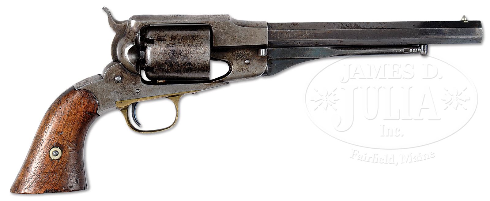 VERY RARE MARTIALLY MARKED REMINGTON BEALS ARMY PERCUSSION REVOLVER.SN 1845. Cal. .44. Blue finish with 8″ oct bbl, dovetailed German silver cone front sight & 2-line address. Mounted with 2-pc smooth walnut grips matching numbered to this revolver. Both grips have clear, legible military inspector cartouches and there are small inspector initials on various parts including frame, bbl, trigger guard & cyl. Cyl is unnumbered but is an orig type as would have been issued as a spare cyl by the Army. According to FLAYDERMAN’S GUIDE TO ANTIQUE AMERICAN FIREARMS, there were a total of about 1900 of these rare revolvers produced in the period 1861-1862, about half of which were sold to the U.S. Army, making this a rather rare & desirable Remington collector’s item. Also according to reference publication, only about 750 of this model revolver delivered to the Army passed inspection. Surviving specimens of this model are rare, especially those in orig configuration with any orig finish. These revolvers & other Remington models were very popular with the military due to their ease of reloading, especially among cavalry troopers who could carry one or more loaded spare cylinders and quickly reload to continue firing. PROVENANCE: The Elliott Burka Estate Collection. CONDITION: Fine, all matching except cyl as noted. Bbl retains about 80% glossy orig blue showing light wear & flaking. Frame retains traces of blue in sheltered areas having mostly flaked to a light patina. Hammer retains strong case colors, faded on top edge. Cyl retains about 60% orig blue with balance flaked to a light patina. Right grip has chips along bottom edge, and both grips show nicks & dings and retain strong, orig oil finish. Mechanics are fine, brilliant shiny bore, shows very little use. 4-56671 JR111 (6,000-10,000) – Lot 1091