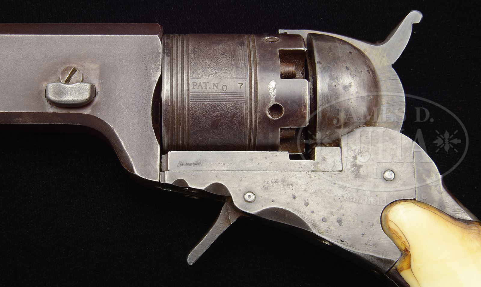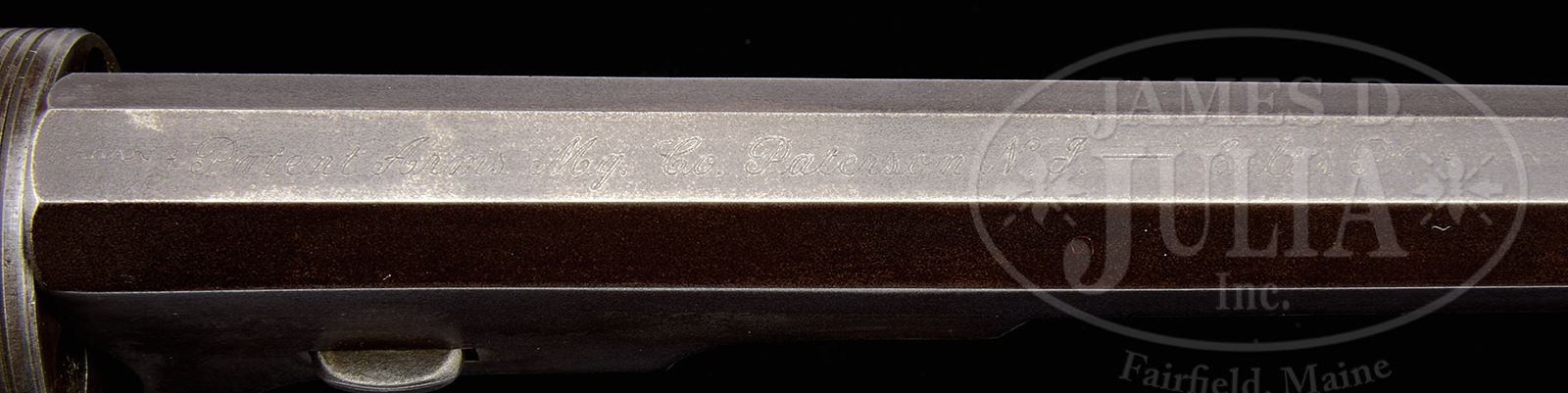 REPRODUCTION COLT NO. 5 BELT MODEL TEXAS PATERSON.SN 2. Cal. .36. Usual configuration with 9″ oct bbl, pinched brass pin front sight with pantographed address “Patent Arms Mg. Co. Paterson N.J.-Colt’s PT.” each end of the address has a small 6 pointed star and a tapering snake pattern like an orig address. Bore is rifled with 11 lands and grooves, right hand twist. Cyl has square shoulder with 5 chambers & a fine left hand stagecoach holdup scene roll marking and bears SN 7. SN 2 and 2 dots are found on rear face of bbl lug, end of cyl spindle and inside front & backstraps. Frame is a decent representation of the Texas Paterson with scalloped edges and folding trigger. Cyl spindle is also a good representation without grease grooves. Grip frame is a little thick but of approximately the same shape as an orig and is mounted with faux Ivory grips. A note that accompanies the revolver states “This item was possibly made by a machinist in Omaha, NE in the 1930’s.” This would make a fine representative slot-filler in a collection until a real one could be purchased. PROVENANCE: Rod Fuller Estate Collection. CONDITION: Fine, overall retains a smooth, dark brown patina showing cleaned areas on left side of frame & backstrap. Mechanics are fine, bright shiny bore. 49291-35 JR (1,000-2,000) – Lot 1091 Click here to view provenance