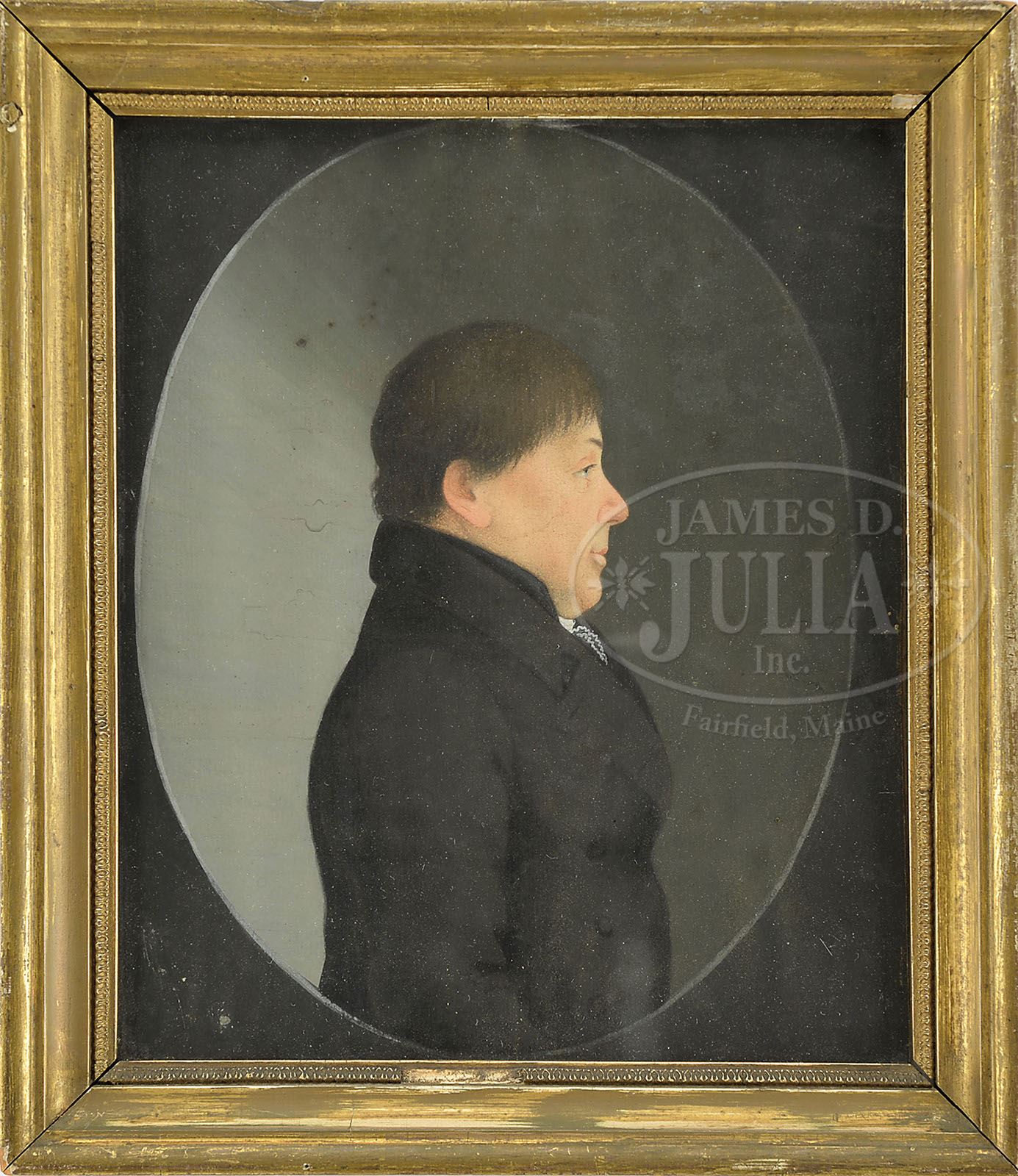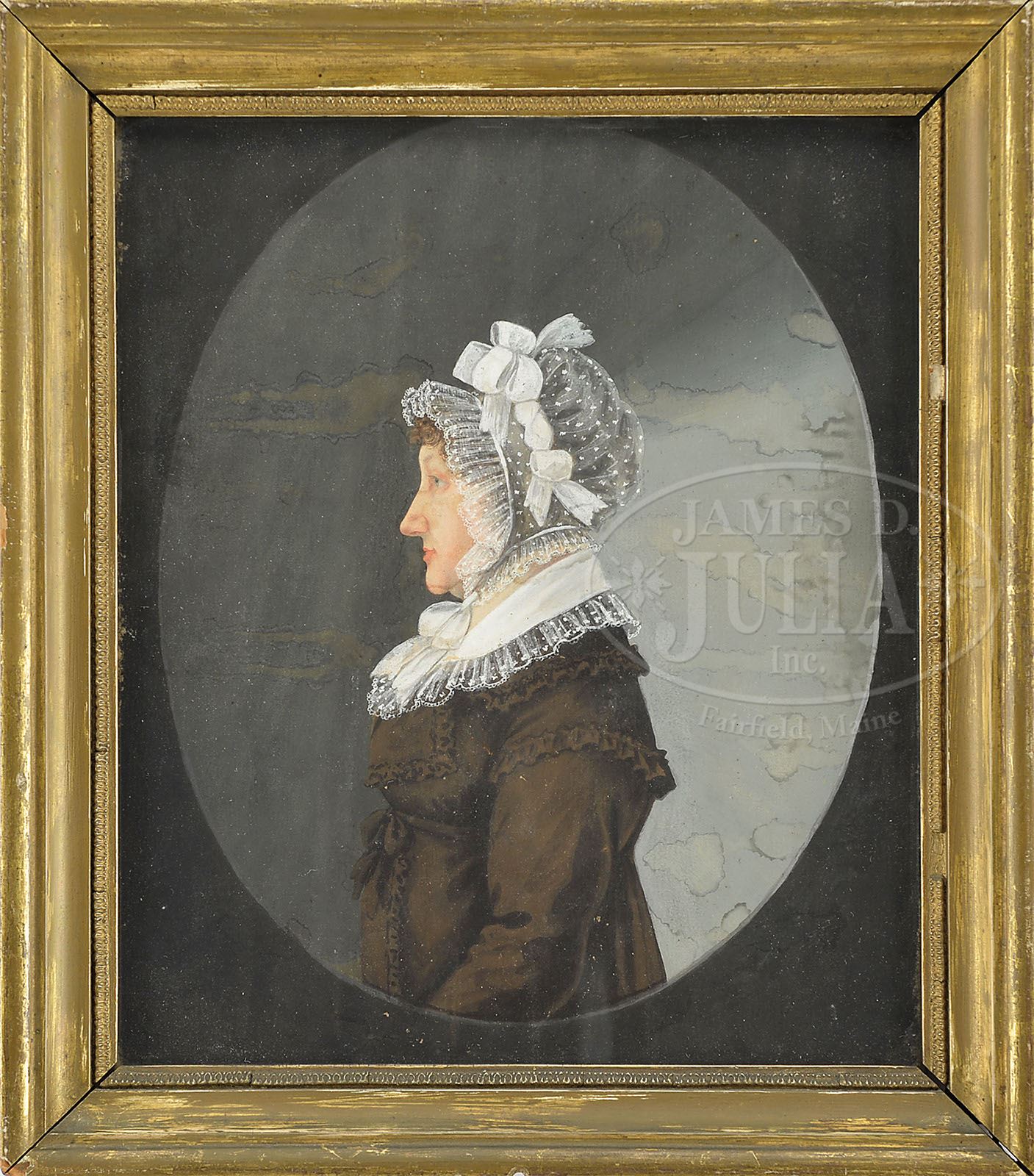 JAMES SHARPLES SR. (American, 1751-1811) PAIR OF THE SWEET FAMILY PORTRAITS. Watercolor paper mounted to panel Both housed in identical antique gilt molded wood frames with original glass Unsigned SIZE: 11-1/2″ x 9″. Overall: 12-3/4″ x 11″. CONDITION: Water stains but colors are vivid. Otherwise generally good. 9-90651 (5,000-8,000)
