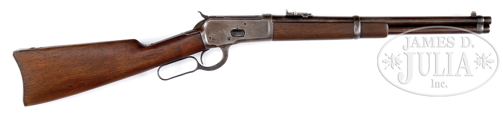 *WINCHESTER MODEL 1892 SADDLE RING CARBINE TRAPPER MODEL WITH 16″ BARREL.SN 386756. Cal. 44 WCF 16″ bbl. Blue finish. Straight grained American walnut stocks with carbine butt and saddle ring. Standard carbine sights. CONDITION: Very good for this model. Bbl and magazine tube are a smooth gray-brown patina with some staining and slight erosion at muzzle end of magazine. Sights are very good. Bbl markings are sharp and clear. Bore is frosty with visible rifling. Receiver is a gray-brown patina overall with some mars around loading port and screws. Some screws have been replaced. There are some dents on top of receiver along side of bolt. Hammer and lever are dark brown patina. Lever shows some roughness on bottom and loop is slightly bent. Tang marking is very good. Tang screw is a replacement. Stocks are very good and have been lightly cleaned. Buttplate and bbl band are also even gray-brown patina. An opportunity to obtain a 92 Trapper carbine in a bbl length that requires no A.T.F. clearance. 50076-8 TEP C&R (2,000-3,000) – Lot 1092