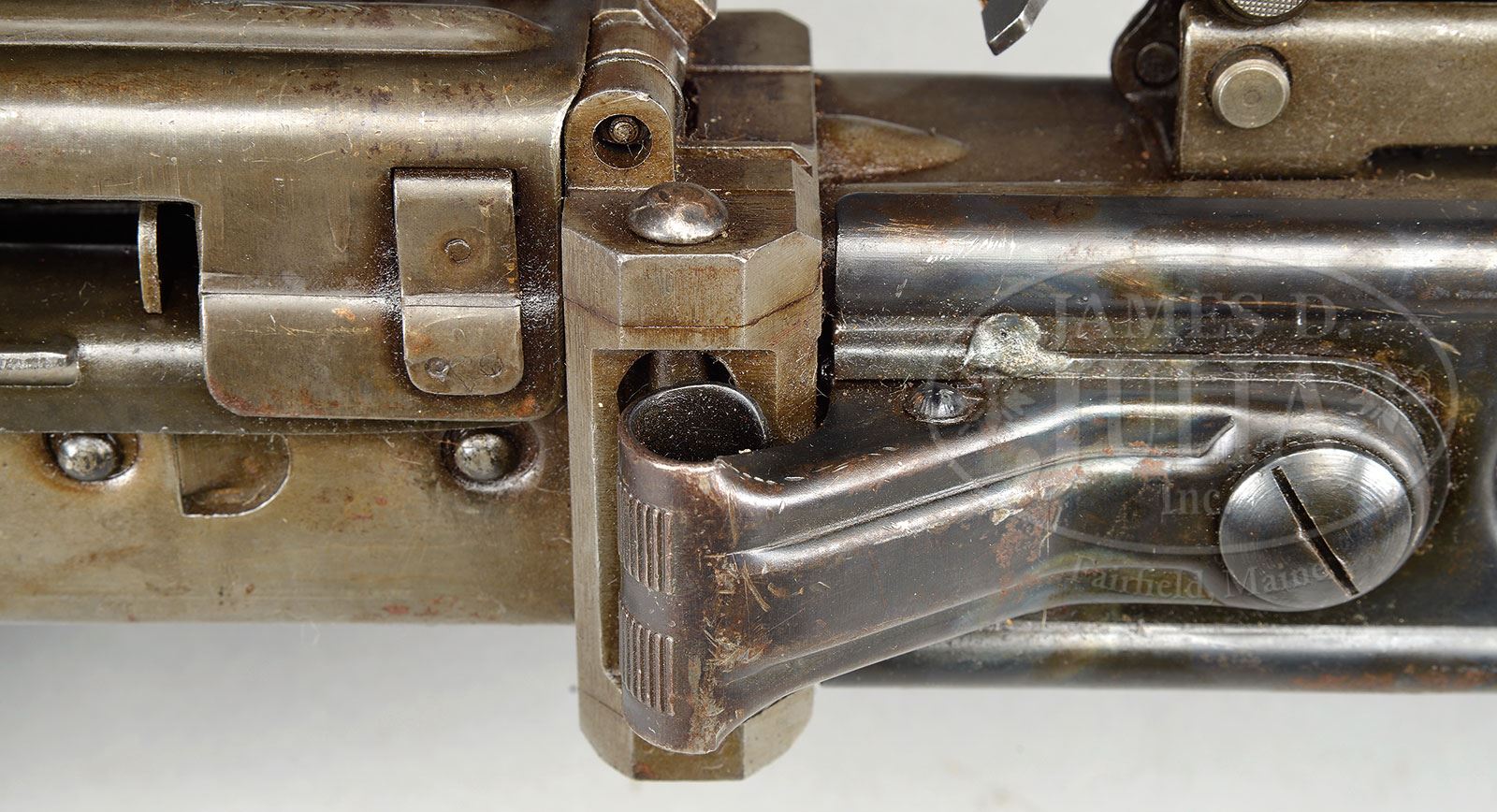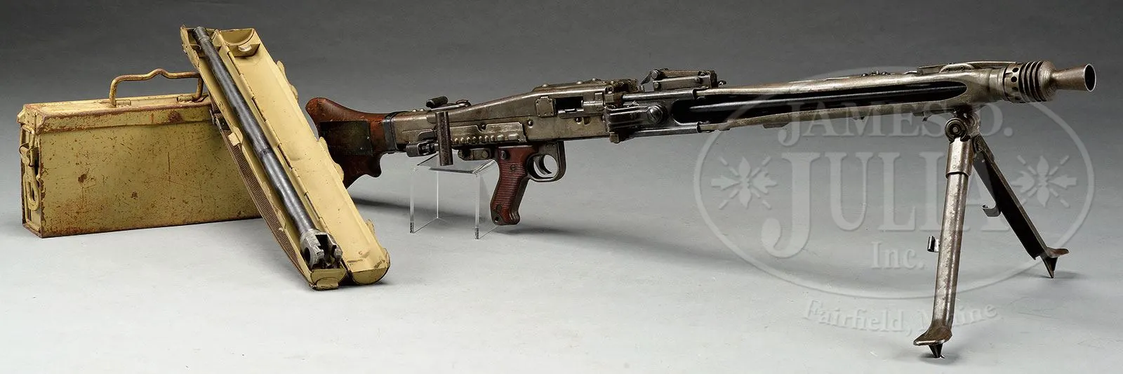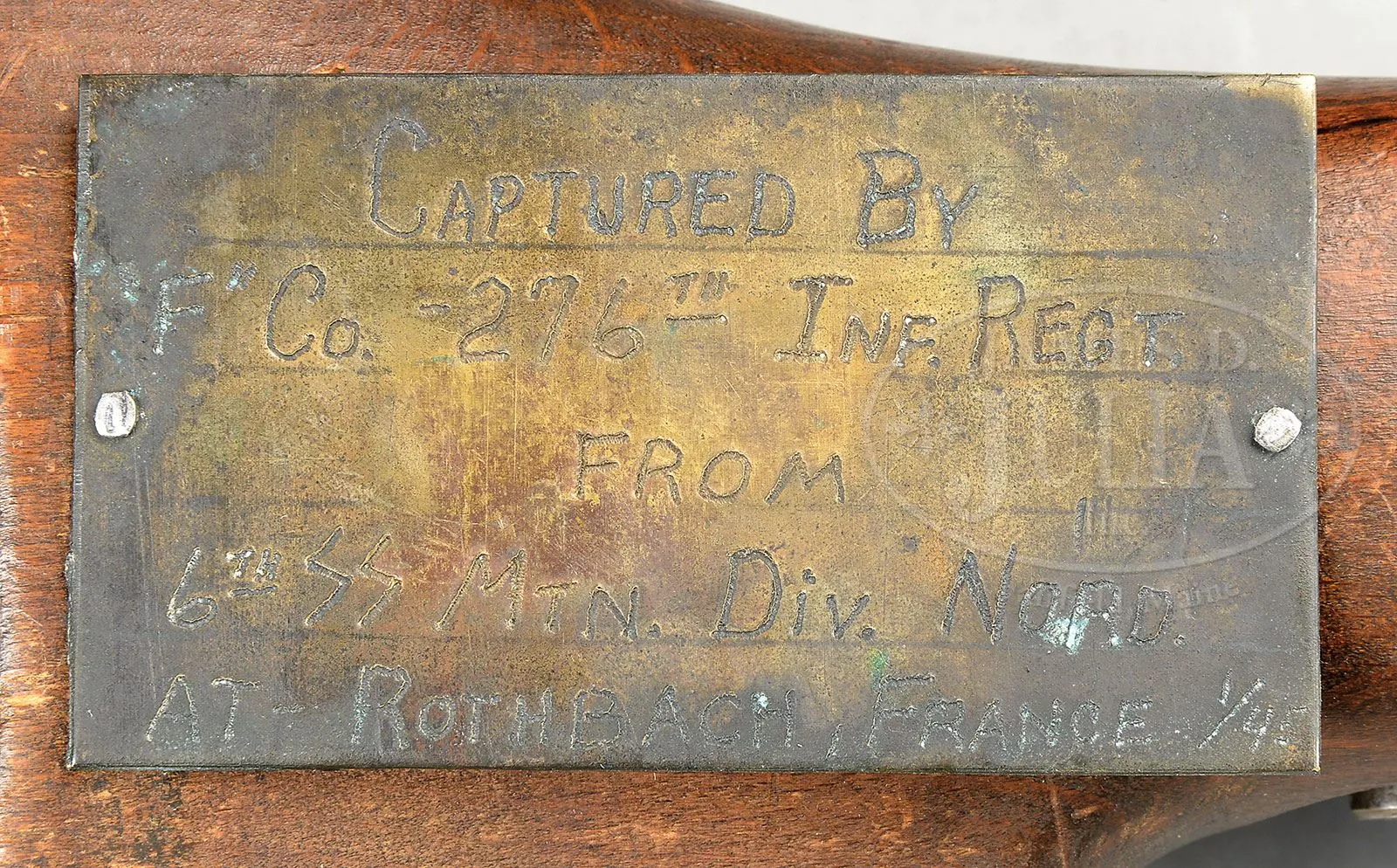 **GERMAN MG42 MACHINE GUN DEWAT CAPTURED FROM 6TH SS DIVISION NEAR ROTHBACK, FRANCE, JANUARY 1945 (C&R).SN SM1785. 7.92mm. 20″ bbl. This MG42 is provenance to have been captured in January of 1945 from 6th SS Mountain division and this must have been a spanking new gun at that time because the markings on the receiver indicate it was made in 1945 by Gustloff. It is marked on left side of receiver “S.M./178J/s v q”. It also has an eagle/swastika with “rea” to left of these markings. Top of receiver marked with eagle/”waa4″ proof mark indicating Gustloff. Top cover is marked “bpr” for Grossfuss. Bolt locking collar is marked “ar” (Mauser) and SN 6837 indicating it is a replacement. Attached orig bipod exhibits rather crude welding and abbreviated manufacturing processes but is still completely serviceable and functional. Included in this lot is an orig brown mustard colored ammunition can marked “ets” which has latches at both ends and a spare bbl marked, “CNX/3” with a bbl collar marked “dot” (Waffenwerke Brunn) in mustard brown carrier which is marked “Laufschutzer/42/Lyq44”. Buttstock has a 3/8″ reinforcement band around it where it meets hardware at front. Also marked on left side with eagle/swastika proof mark over “waa54” and to right of this “hvg 44”. Bolt is backwards within receiver, in forward position with cocking handle frozen in rear position. Bolt head does appear to be present in chamber area. Bbl removal door has been welded shut by spot welding on either side above and below the latch 1″ forward of bolt locking collar. Unable to rotate buffer to remove it from receiver. This weapon is currently unserviceable. This gun was personally captured by then MAJ Theo C. Mataxis on 10 January 1945 near Rothback, France at night while he was reorganizing front line troops after two companies had lost their commanding officers. In the total darkness of the night, Mataxis fell into the machine gun position where this gun was emplaced. The Germans manning the position captured him, relieved him of his .30 Carbine, then ordered him to strip off his clothes for their own use against the bitter cold weather. Mataxis had a concealed .45 ACP pistol under his shirt in a leather shoulder holster, and surprised the Germans, using this to kill three of them in rapid succession, and causing the other two to surrender. Mataxis received Silver Star for actions surrounding capture of this arm, and a copy of this citation is included with this lot. Consignor states this weapon was subsequently loaned to the Infantry test board at Ft. Benning, GA when developing the M-60, due to the MG 42’s fast rate of fire and quick change barrel design. Included in this lot are copies of the original documentation authorizing the weapons exit from the European Theater of Operations, a certified copy of the original amnesty registration form, evidence that this weapon was on display at the Army War College Museum, and a document which states that this weapon was used as a display prop in the film Taps (1981) in the movie home of the General portrayed by actor George C. Scott. Also included is a copy of the Silver Star citation awarded to Mataxis. PROVENANCE: Personal Collection of B.G. (RET) Theo C. Mataxis, Veteran of WWII, Korea, Vietnam, & adviser to Afghanistan forces fighting against Soviet occupation during the 1980s. CONDITION: Overall finish and appearance is very good with about 70% of smooth gray late war finish remaining with balance brown patina and some brown scale on bipod. Red hand grip panels are in extremely fine and attractive condition. Ammunition can retains about 70% of its brown finish, otherwise with heavy scale corrosion, but it remains serviceable. Spare bbl is very good condition with some scratches and spots of surface corrosion; bore is very good, shiny with some slight pitting. Spare bbl carrier retains about 85% of its mustard brown paint with spots of bare metal and corrosion showing through. Web sling is soft but completely serviceable, starting to fray at sling swivels. Museum textile marking on bottom of bbl locking collar. Brass plate affixed to right side of buttstock, “CAPTURED BY/’F’Co-276TH INF. REGT./FROM/6TH SS MNT. Div. NORD./AT-ROTHBACK, FRANCE 1/45”. This is an extremely interesting piece from the point of researching late war German manufacturing shortcuts, and even more meaningful, is the historical provenance surrounding its capture. 4-51962 JWK107 (15,000-25,000) 4-51962 JWK107 (15,000-25,000) – Lot 1093 Click here to view provenance
