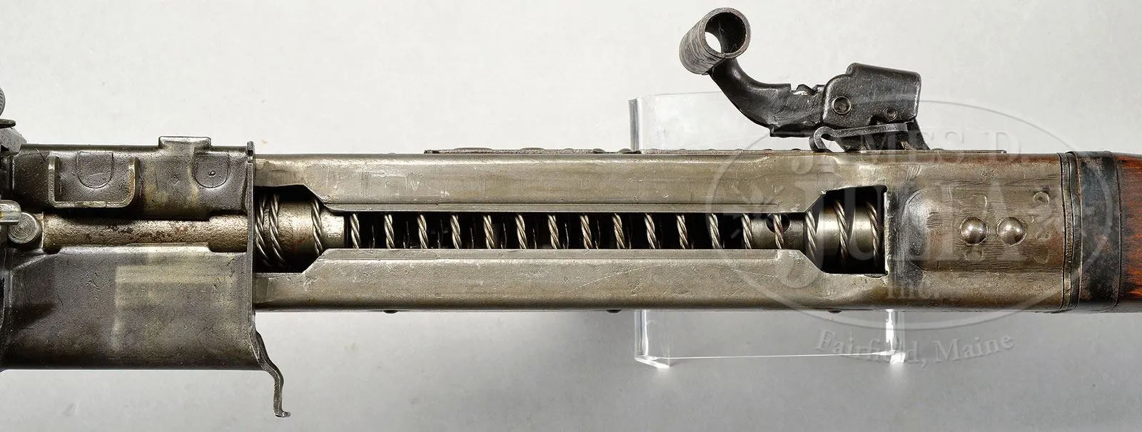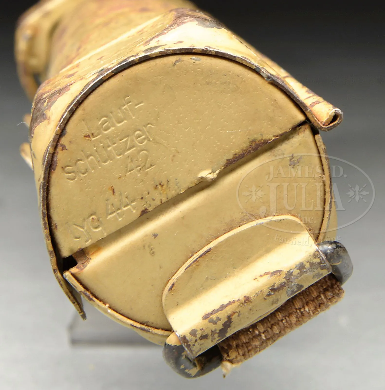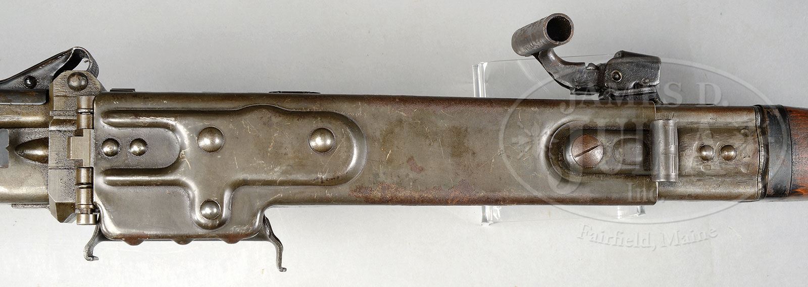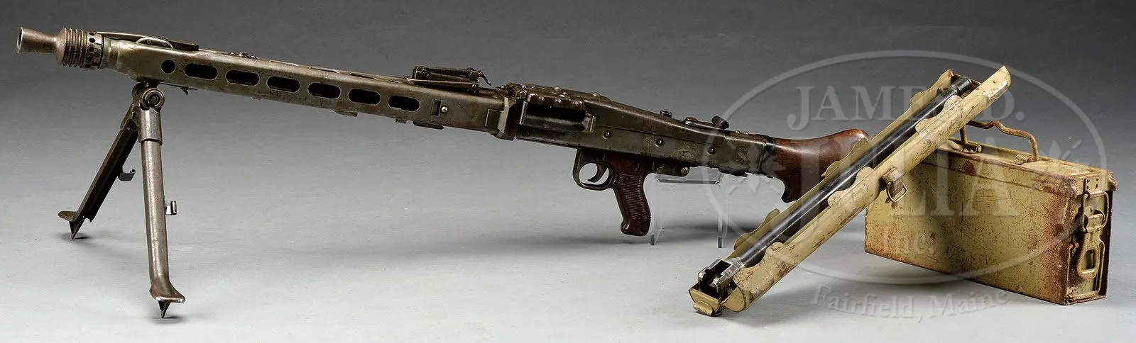 **GERMAN MG42 MACHINE GUN DEWAT CAPTURED FROM 6TH SS DIVISION NEAR ROTHBACK, FRANCE, JANUARY 1945 (C&R).SN SM1785. 7.92mm. 20″ bbl. This MG42 is provenance to have been captured in January of 1945 from 6th SS Mountain division and this must have been a spanking new gun at that time because the markings on the receiver indicate it was made in 1945 by Gustloff. It is marked on left side of receiver “S.M./178J/s v q”. It also has an eagle/swastika with “rea” to left of these markings. Top of receiver marked with eagle/”waa4″ proof mark indicating Gustloff. Top cover is marked “bpr” for Grossfuss. Bolt locking collar is marked “ar” (Mauser) and SN 6837 indicating it is a replacement. Attached orig bipod exhibits rather crude welding and abbreviated manufacturing processes but is still completely serviceable and functional. Included in this lot is an orig brown mustard colored ammunition can marked “ets” which has latches at both ends and a spare bbl marked, “CNX/3” with a bbl collar marked “dot” (Waffenwerke Brunn) in mustard brown carrier which is marked “Laufschutzer/42/Lyq44”. Buttstock has a 3/8″ reinforcement band around it where it meets hardware at front. Also marked on left side with eagle/swastika proof mark over “waa54” and to right of this “hvg 44”. Bolt is backwards within receiver, in forward position with cocking handle frozen in rear position. Bolt head does appear to be present in chamber area. Bbl removal door has been welded shut by spot welding on either side above and below the latch 1″ forward of bolt locking collar. Unable to rotate buffer to remove it from receiver. This weapon is currently unserviceable. This gun was personally captured by then MAJ Theo C. Mataxis on 10 January 1945 near Rothback, France at night while he was reorganizing front line troops after two companies had lost their commanding officers. In the total darkness of the night, Mataxis fell into the machine gun position where this gun was emplaced. The Germans manning the position captured him, relieved him of his .30 Carbine, then ordered him to strip off his clothes for their own use against the bitter cold weather. Mataxis had a concealed .45 ACP pistol under his shirt in a leather shoulder holster, and surprised the Germans, using this to kill three of them in rapid succession, and causing the other two to surrender. Mataxis received Silver Star for actions surrounding capture of this arm, and a copy of this citation is included with this lot. Consignor states this weapon was subsequently loaned to the Infantry test board at Ft. Benning, GA when developing the M-60, due to the MG 42’s fast rate of fire and quick change barrel design. Included in this lot are copies of the original documentation authorizing the weapons exit from the European Theater of Operations, a certified copy of the original amnesty registration form, evidence that this weapon was on display at the Army War College Museum, and a document which states that this weapon was used as a display prop in the film Taps (1981) in the movie home of the General portrayed by actor George C. Scott. Also included is a copy of the Silver Star citation awarded to Mataxis. PROVENANCE: Personal Collection of B.G. (RET) Theo C. Mataxis, Veteran of WWII, Korea, Vietnam, & adviser to Afghanistan forces fighting against Soviet occupation during the 1980s. CONDITION: Overall finish and appearance is very good with about 70% of smooth gray late war finish remaining with balance brown patina and some brown scale on bipod. Red hand grip panels are in extremely fine and attractive condition. Ammunition can retains about 70% of its brown finish, otherwise with heavy scale corrosion, but it remains serviceable. Spare bbl is very good condition with some scratches and spots of surface corrosion; bore is very good, shiny with some slight pitting. Spare bbl carrier retains about 85% of its mustard brown paint with spots of bare metal and corrosion showing through. Web sling is soft but completely serviceable, starting to fray at sling swivels. Museum textile marking on bottom of bbl locking collar. Brass plate affixed to right side of buttstock, “CAPTURED BY/’F’Co-276TH INF. REGT./FROM/6TH SS MNT. Div. NORD./AT-ROTHBACK, FRANCE 1/45”. This is an extremely interesting piece from the point of researching late war German manufacturing shortcuts, and even more meaningful, is the historical provenance surrounding its capture. 4-51962 JWK107 (15,000-25,000) 4-51962 JWK107 (15,000-25,000) – Lot 1093 Click here to view provenance