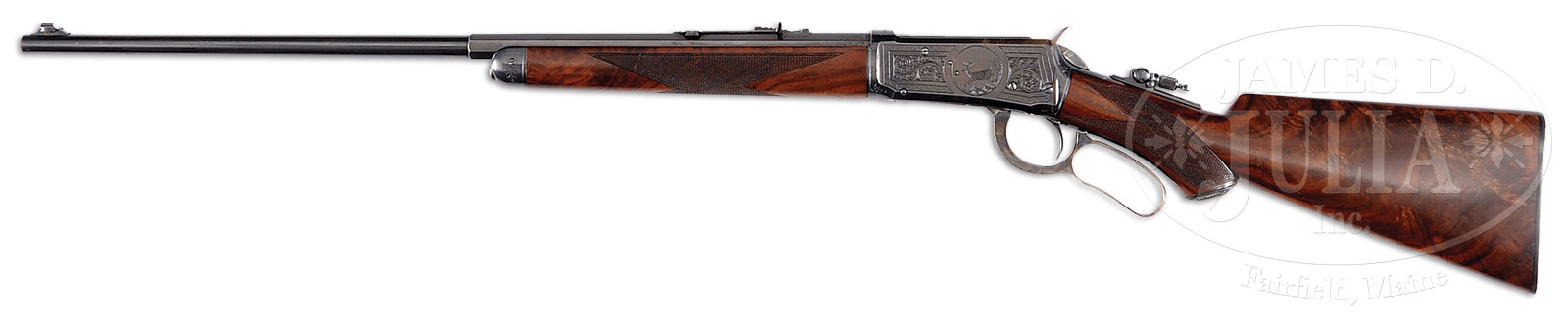 *RARE SPECIAL ORDER CONRAD ULRICH ENGRAVED WINCHESTER MODEL 1894 LIGHTWEIGHT EXTRA FINE CONDITION RIFLE.SN 157393. Cal. 32-40. Beautiful engraved ’94 with 24-1/4″ oct to rnd extra-light bbl with pedestal mounted King, mirrored, red ivory bead front sight, flat top rear sight and a locking Lyman combination tang sight. Mounted with very highly figured flame grain American walnut with “H” style checkered forearm and capped pistol grip stock with Winchester hard rubber buttplate. Left side of lower tang, under the wood is stamped with the assembly number “15845”, “XX” and “OFR”. The matching assembly number is found in top tang channel of buttstock along with “94”. Receiver is beautifully engraved by Conrad Ulrich in style “9” with the rnd vignette of a running whitetail buck in a field scene on left side and the vignette of a standing whitetail buck in a field scene on the right side, all surrounded by light patterns of foliate arabesque engraving and snake & dot borders. Top & bottom of receiver, top tang & forend cap are engraved to match. Engraving patterns extend over all the exposed flats of bbl over chamber area. Accompanied by a Cody Firearms Museum letter and a copy of the shipping record which identify this rifle in caliber 32-40 with 24″ nickel steel extra-light, half oct bbl, half magazine, checkered stock with pistol grip and shotgun butt with rubber buttplate, sporting rear, Lyman front & flattop sights, shotgun butt with rubber buttplate and oil finish, received in warehouse Nov. 25, 1903 and shipped Nov. 27, 1903 to Order #204134. Factory letter also states “Engraved $4.00, Style 9” confirming factory ordered engraving. PROVENANCE: Ex-Wes Adams Collection. Special Note: This item(s) contains plant or animal properties that may be covered by the Endangered Species Act (ESA). We have taken care to ensure that this item(s) meets the standard for sale under the ESA. However, certain states and other countries have laws that are more restrictive than the ESA. It is the bidder’s responsibility to ensure that it is lawful to purchase or transport this item(s) into their state, and to obtain the necessary import and export approvals. Delay or failure to obtain any such permit or approval does not relieve the buyer of paying for the item(s) and consummating the purchase. CONDITION: Extremely fine. Bbl retains about 95% strong orig blue with a couple of small cleaned spots on upper rnd section which shows spots of pinprick pitting. Octagonal section has light sharp edge wear; receiver retains 95-97% strong orig blue with sharp edge wear, some minor pinpricks of pitting on left side and thinning to the top rear edges, turned a little plum; hammer retains bright case colors, moderately faded on top edge; sides of lever & sheltered areas retain bright case colors, faded on outer faces; wood is sound with a very few, very minor nicks & scratches and retains about all of its strong orig oil finish. Sights also matching, extremely fine condition with finish in front. King patented sight retains “certifiable antique ivory” red dyed bead. Mechanics are crisp, brilliant shiny bore. 50412-4 (40,000-60,000) C&R; ESA – Lot 1093 Click here to view provenance