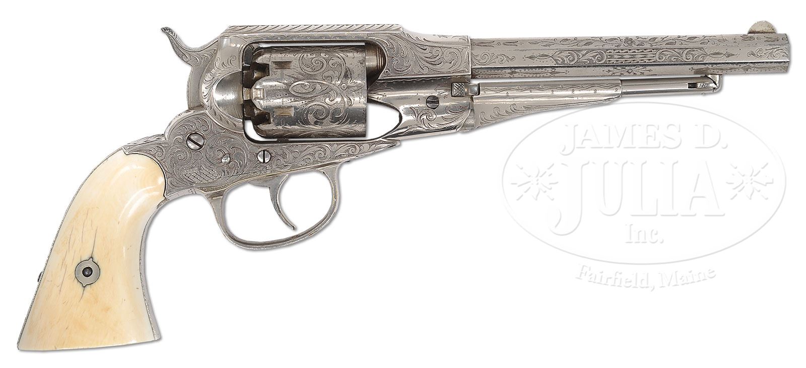 RARE CASED & FACTORY ENGRAVED REMINGTON NEW MODEL BELT DA REVOLVER FROM THE RENOWNED KARL MOLDENHAUER COLLECTION.SN 117. Cal. 36. Nickel finish with 6-1/2″ oct bbl, nickel silver half moon front sight and 3-line address that is very lightly struck on bottom line not showing “NEW MODEL” at all. Mounted with smooth 2-pc certifiable antique ivory grips. Butt strap is marked in white ink “KM 216” which is the inventory number from the renowned Karl Moldenhauer Collection sold by the Richard Bourne Auction Co. in 1980. This revolver is listed as item #142 in the hardbound publication of that auction and is identified by SN and full description as written by renowned collector/dealer, Eric Vaule. Revolver is full factory engraved, probably by the master himself, L.D. Nimschke, in flowing foliate arabesque patterns with an unusual shaded diamond panel on each side of the frame. The bbl is fully engraved on seven of the eight flats in a variety of patterns and the rammer web is also engraved with foliate arabesque patterns and snake & dot patterns. Top strap is engraved in feather patterns and edges of top strap with snake & dot patterns. Top of back strap is engraved with a fine fan pattern. Back strap is engraved in matching foliate arabesque patterns with snake & dot patterns on butt strap. Trigger bow is engraved in geometric patterns and a hunter star. Sides of the hammer spur are also engraved. Cylinder is also fully engraved in a variety of patterns. This is one of the more elaborately engraved Remingtons known and likely was an exhibition piece. Accompanied by an orig, burgundy velvet lined mahogany casing, compartmented in the bottom for the revolver, an angle spout Remington flask, a 2-cavity bullet & ball mold with sprue cutter, a brass & steel cleaning rod and a lacquered tin of Eley’s caps. It would be very difficult to improve on this revolver. Special Note: This item contains or is made of ivory. Do not bid on this lot unless you have read and agreed to our“Ivory Position Statement”and the “Waiver of Legal and Financial Risk to James D. Julia in regards to your Purchase of an Ivory Object”. This information is located in our catalog on pages 30 and 31. PROVENANCE: The Elliott Burka Estate Collection. CONDITION: Extremely fine. Overall retains 96-98% crisp orig nickel with a few minor pimples on the bbl and left frame gullet; cyl retains about 96-97% strong orig nickel with one small area of thinning & losses; front face of cyl is gray metal. Grips have fine age lines in the right side, otherwise they are sound and show a fine ivory patina. Mechanics are crisp, bright shiny bore. Case has a crack and a couple of grain checks in the lid, otherwise is sound with nicks, scratches & dings and retains about 90% orig varnish; interior is heavily faded with moderate soil; case partitions are solid; flask is fine and shows about 75% orig finish; mold is gray metal patina; cleaning rod has a dark brown brass handle; cap tin is fine. 4-56536 JR157 (25,000-40,000) – Lot 1094